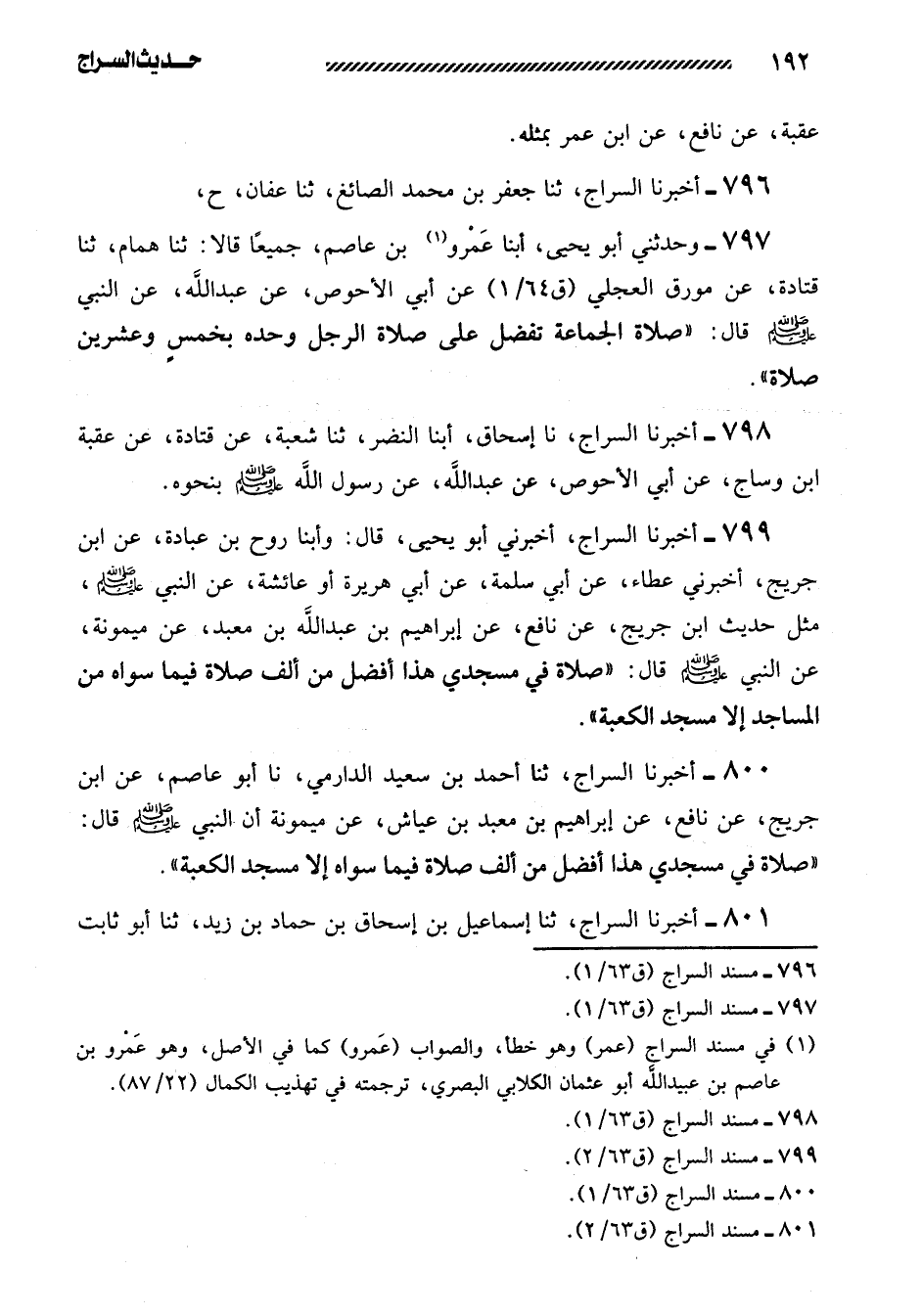 797- وحدثني أبو يحيى، أبنا عَمْرُو بْنُ عَاصِمٍ، جَمِيعًا قَالا: ثنا هَمَّامٌ، ثنا قَتَادَةُ، عَنْ مُوَرِّقٍ الْعِجْلِيِّ عَنْ أَبِي الأَحْوَصِ، عَنْ عَبْدِ اللَّهِ، عَنِ النَّبِيِّ صَلَّى اللَّهُ عَلَيهِ وَسَلَّمَ قَالَ: ((صَلاةُ الْجَمَاعَةِ تَفْضُلُ عَلَى صَلاةِ الرَّجُلِ وَحْدَهُ بخمسٍ وَعِشْرِينَ صَلاةً)) .
