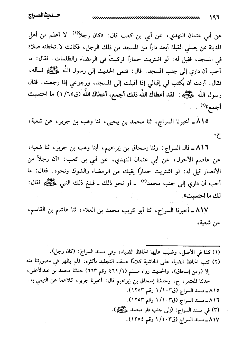 816- قَالَ السراج: وثنا إسحاق بن إبراهيم، أبنا وَهْبُ بْنُ جَرِيرٍ، ثنا شُعْبَةُ، عَنْ عَاصِمٍ الأَحْوَلِ، عَنْ أَبِي عُثْمَانَ النَّهْدِيِّ، عَنْ أُبَيِّ بْنِ كَعْبٍ: ((أَنَّ رَجُلا مِنَ الأَنْصَارِ قِيلَ لَهُ: لَوِ اشْتَرَيْتَ حِمَارًا يَقِيكَ مِنَ الرَّمْضَاءِ وَالشَّوْكِ وَنَحْوِهِ. فَقَالَ: مَا أَحَبَّ أَنَّ دَارِي إِلَى جَنْبِ مُحَمَّدٍ -أَوْ نَحْوَ ذَلِكَ- فَبَلَغَ ذلك النبي صلى الله عليه وسلم فقال: لَكَ مَا احْتَسَبْتَ)) .