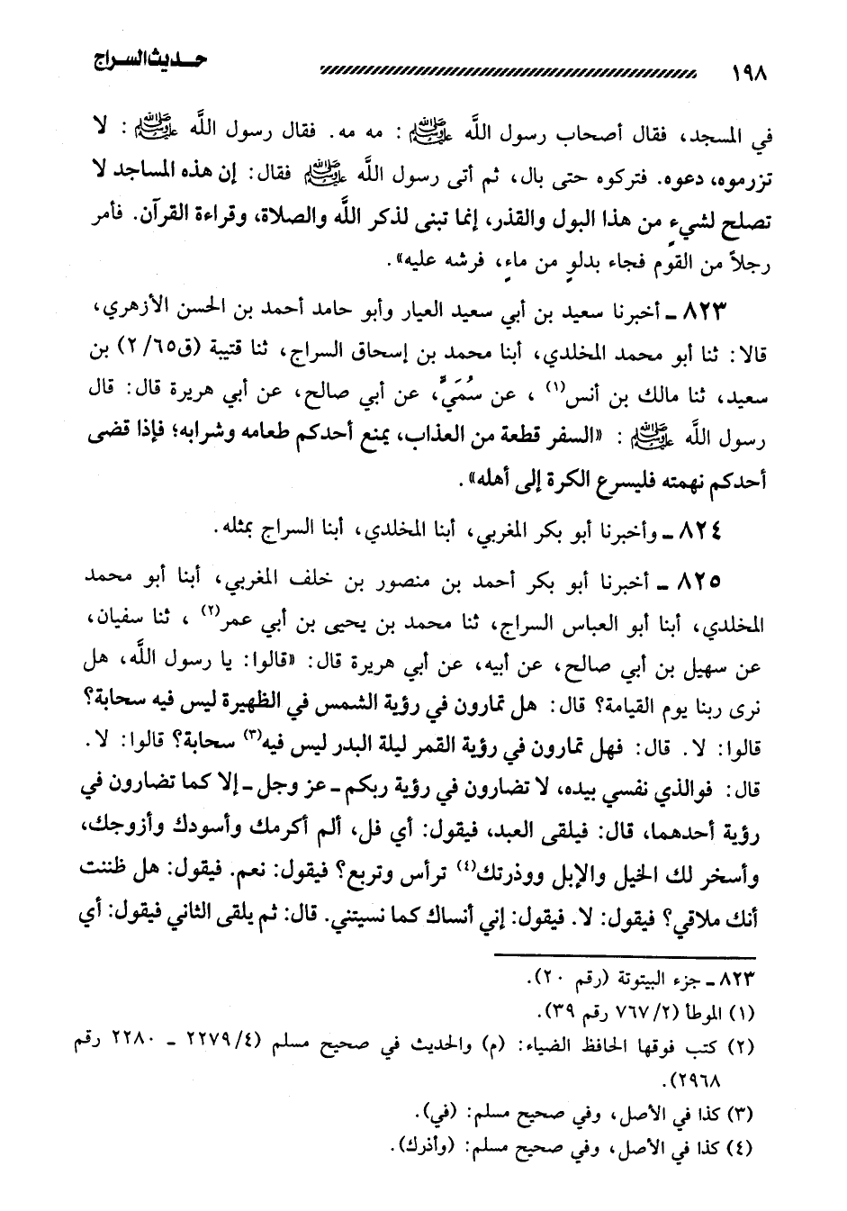 823- أَخْبَرَنَا سَعِيدُ بْنُ أَبِي سَعِيدٍ الْعَيَّارُ وَأَبُو حَامِدٍ أَحْمَدُ بْنُ الْحَسَنِ الأَزْهَرِيُّ، قَالا: ثنا أبو محمد المخلدي، أبنا مُحَمَّدُ بْنُ إِسْحَاقَ السَّرَّاجُ، ثنا قُتَيْبَةُ بْنُ سَعِيدٍ، ثنا مَالِكُ بْنُ أَنَسٍ، عَنْ سُمَيٍّ، عن أبي صالح، عن أبي هريرة قال: قال رسول الله صلى الله عليه وسلم: ((السَّفَرُ قِطْعَةٌ مِنَ الْعَذَابِ، يَمْنَعُ أَحَدَكُمْ طَعَامَهُ وَشَرَابَهُ؛ فَإِذَا قَضَى أَحَدُكُمْ نَهْمَتَهُ فَلْيُسْرِعِ الْكَرَّةَ إلى أهله)) .
