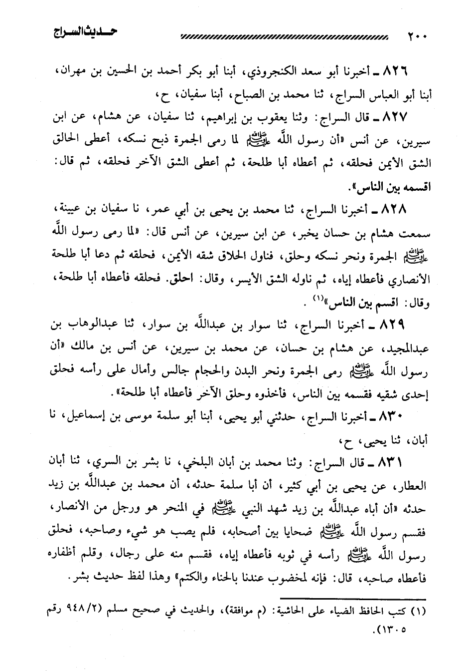 829- أَخْبَرَنَا السَّرَّاجُ، ثنا سَوَّارُ بْنُ عَبْدِ اللَّهِ بْنِ سَوَّارٍ، ثنا عَبْدُ الْوَهَّابِ بْنُ عَبْدِ الْمَجِيدِ، عَنْ هِشَامِ بْنِ حَسَّانٍ، عَنْ مُحَمَّدِ بْنِ سِيرِينَ، عَنْ أَنَسِ بْنِ مَالِكٍ ((أَنَّ رسول الله صلى الله عليه وسلم رمي الجمرة ونحر البدن والحجام جالس وأمال عَلَى رَأْسِهِ فَحَلَقَ إِحْدَى شِقَّيْهِ فَقَسَمَهُ بَيْنَ النَّاسِ، فَأَخَذُوهُ وَحَلَقَ الآخَرَ فَأَعْطَاهُ أَبَا طَلْحَةَ)) .
