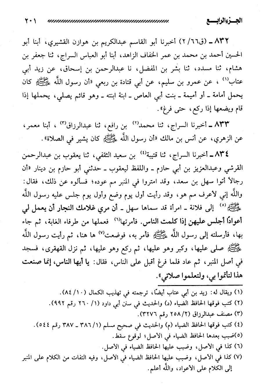 834- أَخْبَرَنَا السَّرَّاجُ، ثنا قُتَيْبَةُ بْنُ سَعِيدٍ الثَّقَفِيُّ، ثنا يَعْقُوبُ بْنُ عَبْدِ الرَّحْمَنِ الْقُرَشِيُّ وَعَبْدُ الْعَزِيزِ بْنُ أَبِي حَازِمٍ -وَاللَّفْظُ لِيَعْقُوبَ- حَدَّثَنِي أَبُو حَازِمِ بْنُ دِينَارٍ ((أَنَّ رِجَالا أَتَوْا سَهْلَ بْنَ سَعْدٍ، وَقَدِ امْتَرَوْا فِي الْمِنْبَرِ مِمَّ عُودُهُ؛ فَسَأَلُوهُ عَنْ ذَلِكَ، فَقَالَ: وَاللَّهِ إني لأعرب مم هو، وقد رَأَيْتُ أَوَّلَ يَوْمٍ وُضِعَ وَأَوَّلَ يَوْمٍ جَلَسَ عليه رسول الله صلى الله عليه وسلم إِلَى فُلانَةَ -امْرَأَةٍ قَدْ سَمَّاهَا سَهْلٌ- أَنْ مُرِي غُلامَكِ النَّجَّارَ أَنْ يَعْمَلَ لِي أَعْوَادًا أجلس عليهن إذا كلمت الناس. فأمرتها فَعَمِلَهَا مِنْ طَرْفَاءِ الْغَابَةِ، ثُمَّ جَاءَ بِهَا، فَأَرْسَلَتْهُ إِلَى رَسُولِ اللَّهِ صَلَّى اللَّهُ عَلَيْهِ وسلم فأمر به، فوضعت ها هنا، ثُمَّ رَأَيْتُ رَسُولَ اللَّهِ صَلَّى اللَّهُ عَلَيهِ وَسَلَّمَ صَلَّى عَلَيْهَا، وَكَبَّرَ وَهُوَ عَلَيْهَا، ثُمَّ رَكَعَ وَهُوَ عَلَيْهَا، ثُمَّ نَزَلَ الْقَهْقَرَى، فَسَجَدَ فِي أَصْلِ الْمِنْبَرِ، ثُمَّ عَادَ فَلَمَّا فَرَغَ أقبل على الناس، فقال: يا أيها النَّاسُ، إِنَّمَا صَنَعْتُ هَذَا لِتَأْتَمُّوا بِي، وَلِتَعْلَمُوا صلاتي)) .