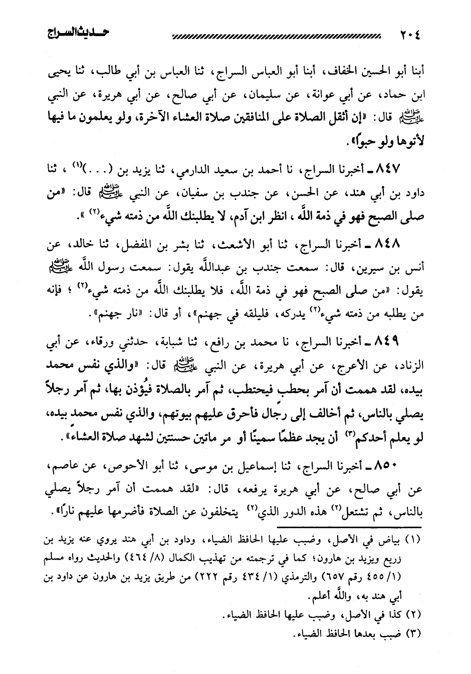848- أَخْبَرَنَا السَّرَّاجُ، ثنا أَبُو الأَشْعَثِ، ثنا بِشْرُ بْنُ الْمُفَضَّلِ، ثنا خَالِدٌ، عَنْ أَنَسِ بْنِ سِيرِينَ، قَالَ: سَمِعْتُ جُنْدُبَ بْنَ عَبْدِ اللَّهِ يقول: سمعت رسول الله صلى الله عليه وَسَلَّمَ يَقُولُ: ((مَنْ صَلَّى الصُّبْحَ فَهُوَ فِي ذِمَّةِ اللَّهِ، فَلا يَطْلُبَنَّكَ اللَّهُ مِنْ ذِمَّتِهِ شيء؛ فإنه من يطلبه من ذمته شيء يدركه، فليلقه فِي جَهَنَّمَ)) ، أَوْ قَالَ: ((نَارِ جَهَنَّمَ)) .