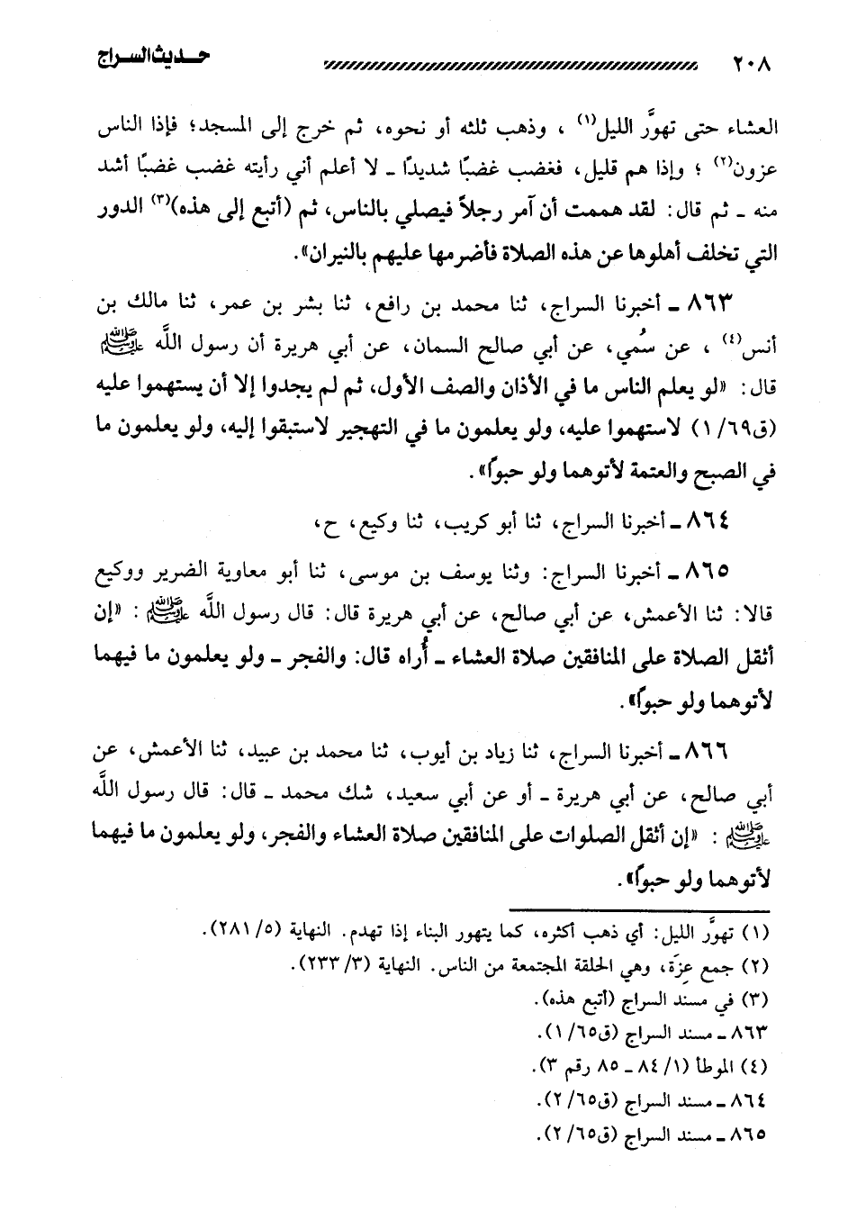 865- أخبرنا السراج، وثنا يوسف بن موسى، ثنا أبو مُعَاوِيَةَ الضَّرِيرُ وَوَكِيعٌ قَالا: ثنا الأَعْمَشُ، عَنْ أبي صالح، عن أبي هريرة قال: قال رسول الله صلى الله عليه وسلم: ((أن أَثْقَلَ الصَّلاةِ عَلَى الْمُنَافِقِينَ صَلاةُ الْعِشَاءِ -أَرَاهُ قَالَ: وَالْفَجْرِ- وَلَوْ يَعْلَمُونَ مَا فِيهِمَا لأَتَوْهُمَا ولو حبواً)) .