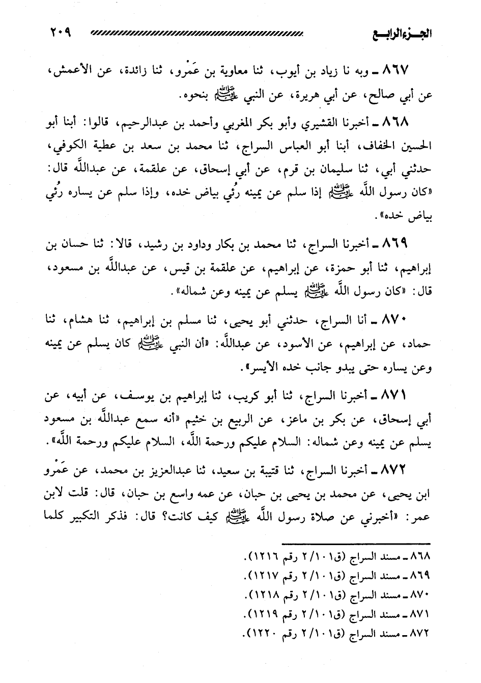 869- أَخْبَرَنَا السَّرَّاجُ، ثنا مُحَمَّدُ بْنُ بَكَّارٍ وَدَاوُدُ بْنُ رُشَيْدٍ قَالا ثنا حَسَّانُ بْنُ إِبْرَاهِيمَ، ثنا أَبُو حَمْزَةَ، عَنْ إِبْرَاهِيمَ، عَنْ عَلْقَمَةَ بْنِ قَيْسٍ، عَنْ عَبْدِ اللَّهِ بْنِ مَسْعُودٍ، قال: ((كان رسول الله صلى الله عليه وسلم يسلم عن يمينه وعن شماله)) .