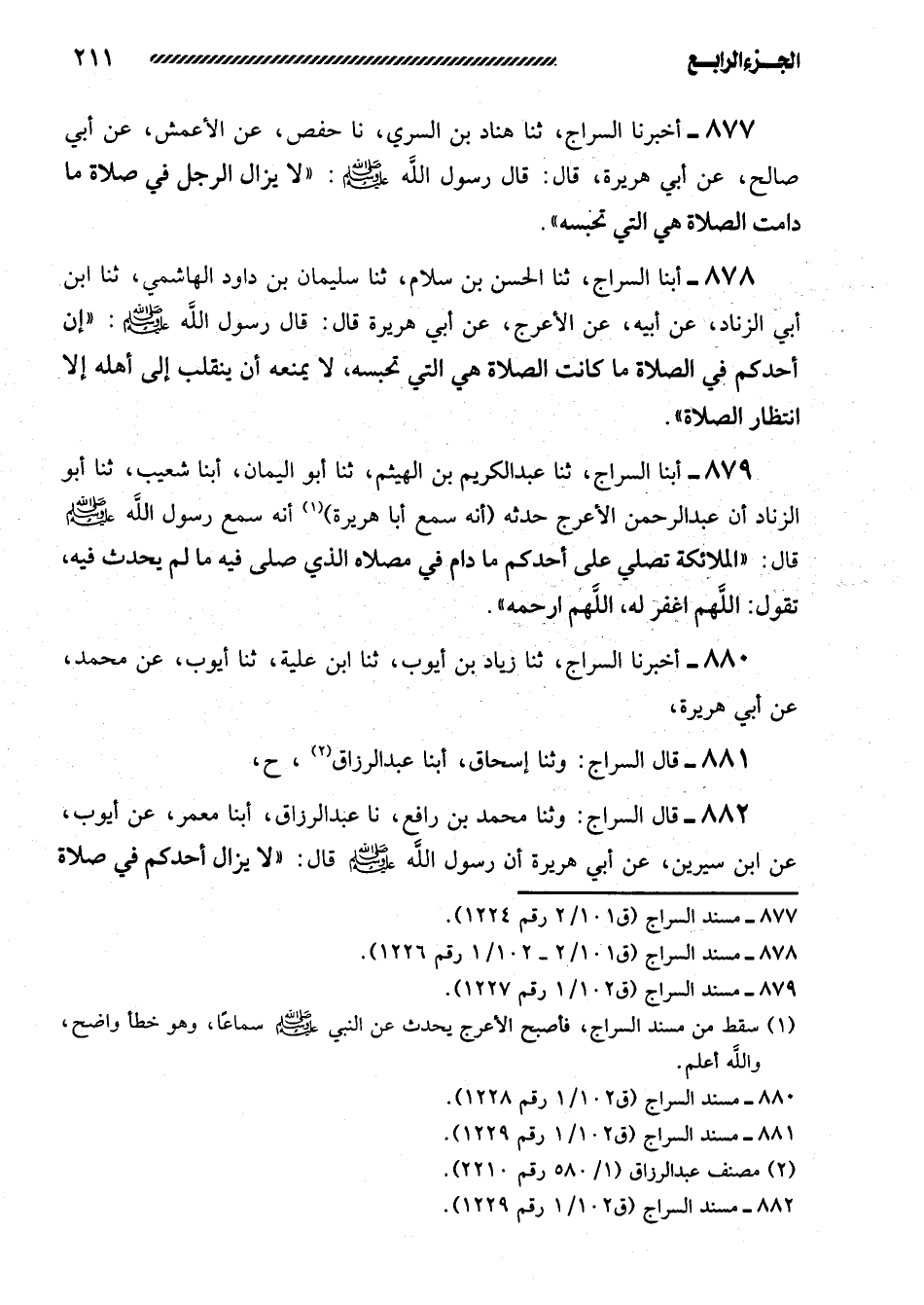 877- أَخْبَرَنَا السَّرَّاجُ، ثنا هَنَّادُ بْنُ السَّرِيِّ، نا حَفْصٌ، عَنِ الأَعْمَشِ، عَنْ أَبِي صَالِحٍ، عَنْ أبي هريرة، قال: قال رسول الله صلى الله عليه وسلم: ((لا يزال الرجل في صَلاةٍ مَا دَامَتِ الصَّلاةُ هِيَ الَّتِي تَحْبِسُهُ)) .