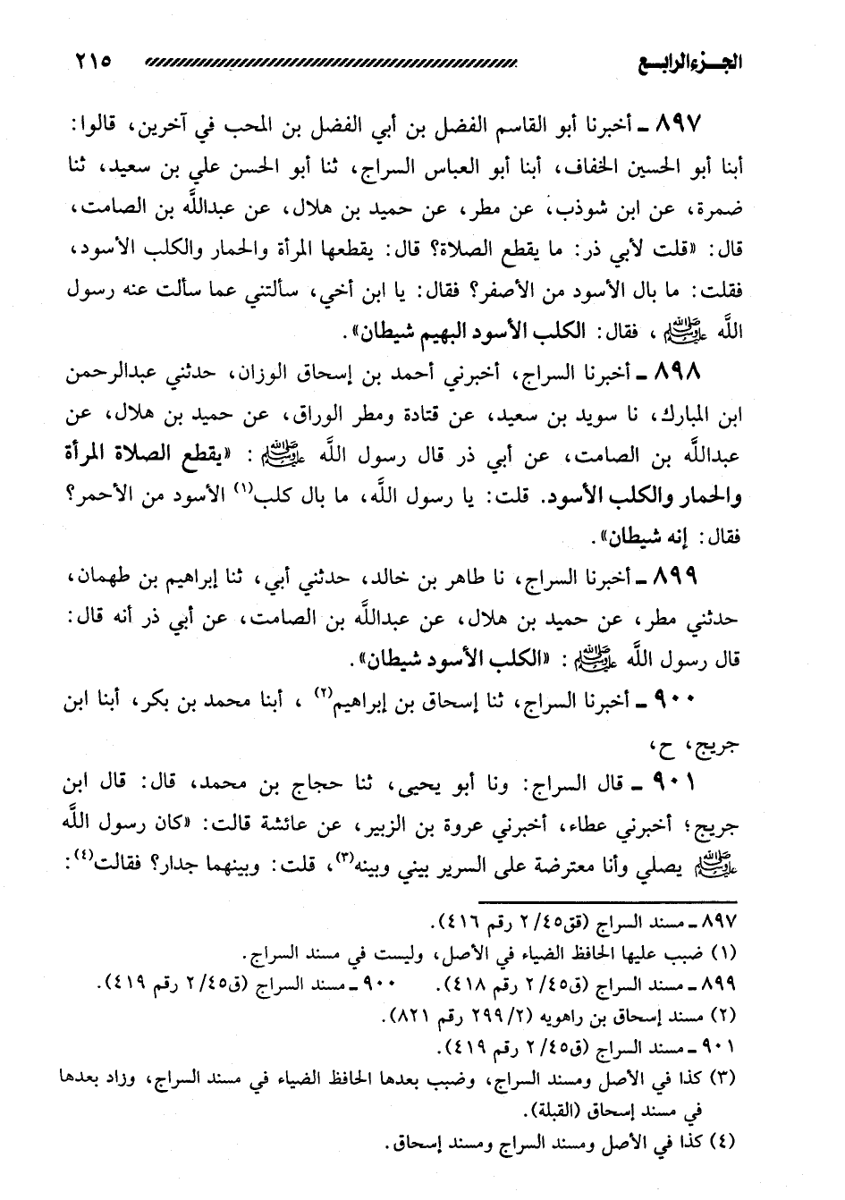 897- أَخْبَرَنَا أَبُو الْقَاسِمِ الْفَضْلُ بْنُ أَبِي الْفَضْلِ بن المحب في آخرين، قالوا: أبنا أبو الحسين الخفاف، أبنا أَبُو الْعَبَّاسِ السَّرَّاجُ، ثنا أَبُو الْحَسَنِ عَلِيُّ بن سعيد، ثنا ضَمْرَةُ، عَنِ ابْنِ شَوْذَبٍ، عَنْ مَطَرٍ، عن حميد بن هلال، عن عبد الله بْنِ الصَّامِتِ، قَالَ: ((قُلْتُ لأَبِي ذَرٍّ: مَا يَقْطَعُ الصَّلاةَ؟ قَالَ: يَقْطَعُهَا الْمَرْأَةُ وَالْحِمَارُ وَالْكَلْبُ الأَسْوَدُ، فَقُلْتُ: مَا بَالُ الأَسْوَدِ مِنَ الأَصْفَرِ؟ فقال: يا ابن أَخِي، سَأَلْتَنِي عَمَّا سَأَلْتُ عَنْهُ رَسُولَ اللَّه صَلَّى اللَّهُ عَلَيهِ وَسَلَّمَ، فَقَالَ: الْكَلْبُ الأَسْوَدُ البهيم شيطان)) .