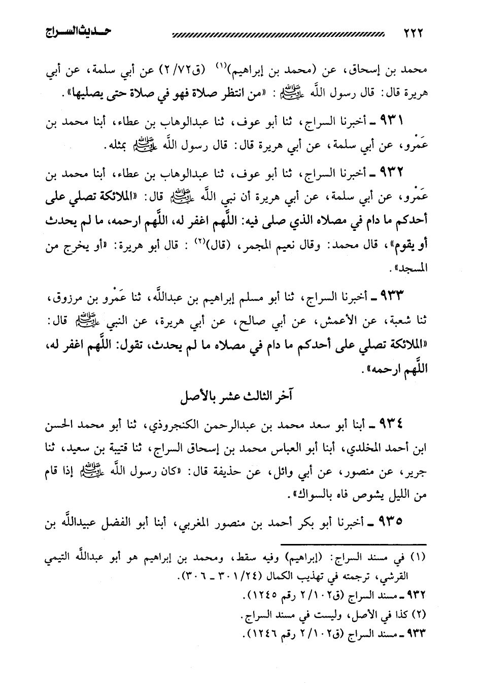 932- أَخْبَرَنَا السَّرَّاجُ، ثنا أَبُو عَوْفٍ، ثنا عَبْدُ الوهاب بن عطاء، أبنا محمد بن عمرو، عن أبي سلمة، عن أَبِي هُرَيْرَةَ أَنَّ نَبِيَّ اللَّهِ صَلَّى اللَّهُ عَلَيهِ وَسَلَّمَ قَالَ: ((الْمَلائِكَةُ تُصَلِّي عَلَى أَحَدِكُمْ مَا دَامَ فِي مُصَلاهُ الَّذِي صَلَّى فِيهِ: اللَّهُمَّ اغْفِرْ لَهُ، اللَّهُمَّ ارْحَمْهُ، مَا لَمْ يحدث أو يقوم)) ، قَالَ مُحَمَّدٌ: وَقَالَ نُعَيْمٌ الْمُجْمِرُ، (قَالَ) : قَالَ أَبُو هُرَيْرَةَ: ((أَوْ يَخْرُجْ مِنَ الْمَسْجِدِ)) .