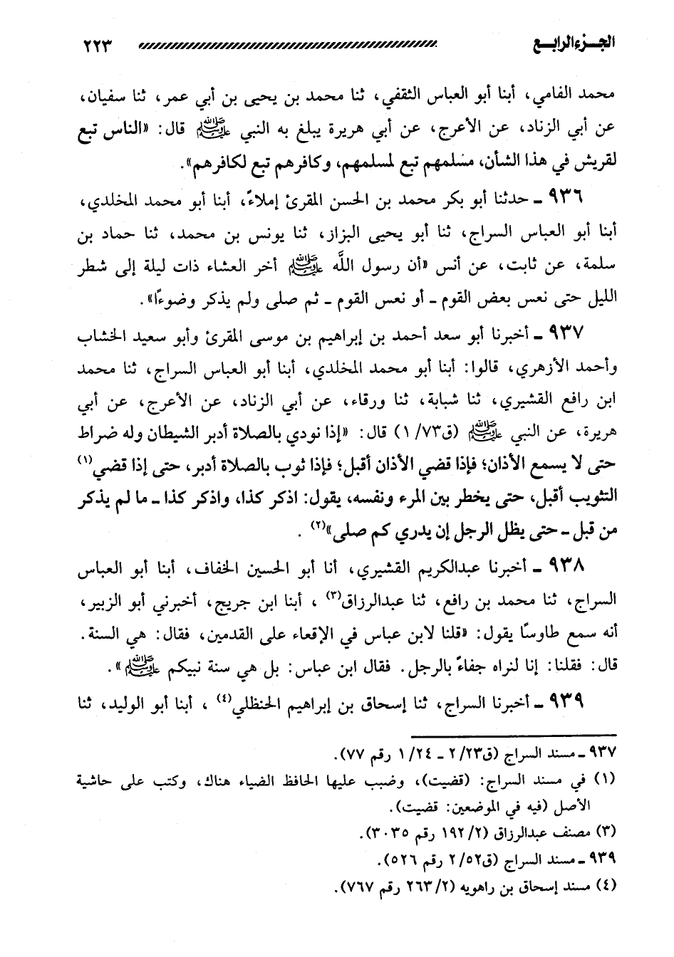 937- أخبرنا أبو سعد أحمد بن إبراهيم بن مُوسَى الْمُقْرِئُ وَأَبُو سَعِيدٍ الْخَشَّابُ وَأَحْمَدُ الأَزْهَرِيُّ، قالوا: أبنا أبو محمد المخلدي، أبنا أبو العباس السراج، ثنا محمد ابن رَافِعٍ الْقُشَيْرِيُّ، ثنا شَبَابَةُ، ثنا وَرْقَاءُ، عَنْ أَبِي الزِّنَادِ، عَنِ الأَعْرَجِ، عَنْ أَبِي هُرَيْرَةَ، عن النبي صلى الله عليه وسلم قال: ((إِذَا نُودِيَ بِالصَّلاةِ أَدْبَرَ الشَّيْطَانُ وَلَهُ ضُرَاطٌ حَتَّى لا يَسْمَعَ الأَذَانَ؛ فَإِذَا قُضِيَ الأَذَانُ أَقْبَلَ؛ فَإِذَا ثُوِّبَ بِالصَّلاةِ أَدْبَرَ، حَتَّى إِذَا قضي التثويب أقبل، حتى يخطر بين المرء وَنَفْسِهِ، يَقُولُ: اذْكُرْ كَذَا، وَاذْكُرْ كَذَا -مَا لَمْ يَذْكُرْ مِنْ قَبْلُ- حَتَّى يَظَلَّ الرَّجُلُ أَنْ يَدْرِيَ كَمْ صَلَّى)) .