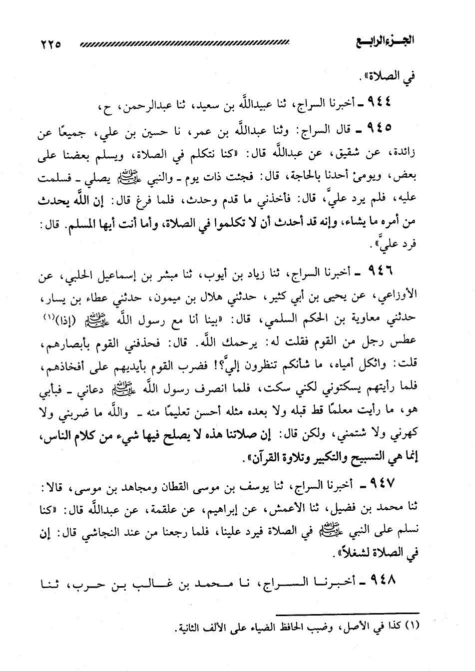 945- قال السراج: وثنا عبد الله بن عمر، نا حسين بن علي، جميعاً عن زائدة، عن شقيق، عن عبد الله قال: ((كنا نتكلم في الصلاة، ويسلم بعضنا على بعض، ويومئ أحدنا بالحاجة، قال: فجئت ذات يوم -والنبي صلى الله عليه وسلم يصلي- فسلمت عليه، فلم يرد علي، قال: فأخذني ما قدم وحدث، فلما فرغ قال: إن الله يحدث من أمره ما يشاء، وإنه قد أحدث أن لا تكلموا في الصلاة، وأما أنت أيها المسلم. قال: فرد علي)) .