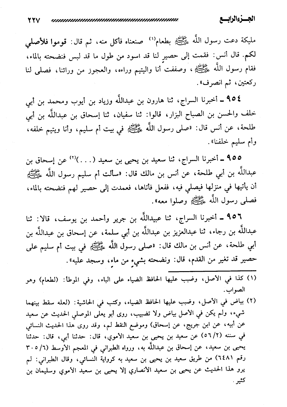 956- أخبرنا السراج، ثنا عبيد الله بن جرير وأحمد بن يوسف، قالا: ثنا عبد الله بن رجاء، ثنا عبد العزيز بن عبد الله بن أبي سلمة، عَنْ إِسْحَاقَ بْنِ عَبْدِ اللَّهِ بْنِ أَبِي طَلْحَةَ، عَنْ أَنَسِ بْنِ مَالِكٍ قَالَ: ((صَلَّى رسول الله صلى الله عليه وسلم في بيت أم سليم على حصير قد تغير من القدم، قال: ونضحته بشيءٍ من ماءٍ، وسجد عليه)) .