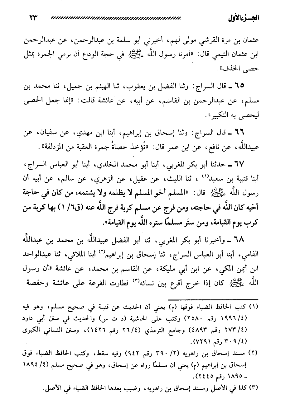 65- قَالَ السَّرَّاجُ: وَثَنَا الْفَضْلُ بْنُ يَعْقُوبَ، ثَنَا الْهَيْثَمُ بْنُ جَمِيلٍ، ثَنَا مُحَمَّدُ بْنُ مُسْلِمٍ، عَنْ عَبْدِ الرَّحْمَنِ بْنِ الْقَاسِمِ، عَنْ أَبِيهِ، عَنْ عَائِشَةَ قَالَتْ: ((إِنَّمَا جُعِلَ الْحَصَى لِيُحْصَى به التكبير) .