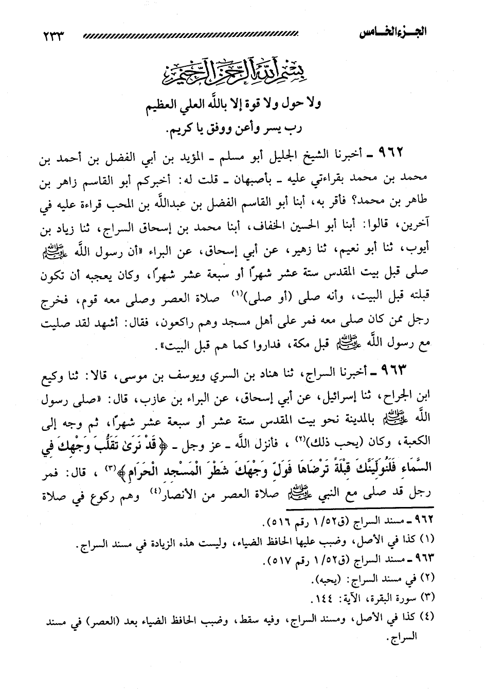 962- أَخْبَرَنَا الشَّيْخُ الْجَلِيلُ أبو مسلم -المؤيد بن أبي الفضل بن أَحْمَدَ بْنِ مُحَمَّدِ بْنِ مُحَمَّدٍ بِقِرَاءَتِي عَلَيْهِ -بأصبهان- قلت له: أخبركم أبو القاسم زاهر بن طاهر بن محمد؟ فأقر به، أبنا أَبُو الْقَاسِمِ الْفَضْلُ بْنُ عَبْدِ اللَّهِ بْنِ المحب قراءة عليه في آخرين، قالوا: أبنا أبو الحسين الخفاف، أبنا محمد بن إسحاق السراج، ثنا زياد بن أَيُّوبَ، ثنا أَبُو نُعَيْمٍ، ثنا زُهَيْرٌ، عَنْ أَبِي إِسْحَاقَ، عَنِ الْبَرَاءِ ((أَنَّ رَسُولَ اللَّهِ صَلَّى اللَّهُ عَلَيهِ وَسَلَّمَ صَلَّى قِبَلَ بَيْتِ الْمَقْدِسِ سِتَّةَ عَشَرَ شَهْرًا أَوْ سَبْعَةَ عَشَرَ شَهْرًا، وَكَانَ يُعْجِبُهُ أَنْ تَكُونَ قِبْلَتُهُ قِبَلَ الْبَيْتِ، وَأَنَّهُ صَلَّى (أَوْ صَلَّى) صَلاةَ الْعَصْرِ وَصَلَّى مَعَهُ قَوْمٌ، فَخَرَجَ رَجُلٌ مِمَّنْ كَانَ صَلَّى مَعَهُ فَمَرَّ عَلَى أَهْلِ مَسْجِدٍ وَهُمْ رَاكِعُونَ، فَقَالَ: أَشْهَدُ لَقَدْ صَلَّيْتُ مَعَ رَسُولِ اللَّهِ صَلَّى اللَّهُ عَلَيهِ وَسَلَّمَ قِبَلَ مَكَّةَ، فَدَارُوا كَمَا هُمْ قِبَلَ الْبَيْتِ)) .
