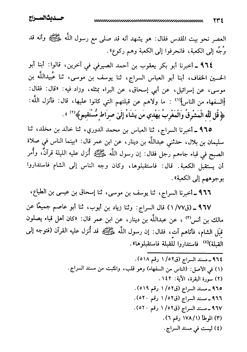 967- قَالَ السَّرَّاجُ: وثنا زِيَادُ بْنُ أَيُّوبَ، ثنا أَبُو عَاصِمٍ جَمِيعًا عَنْ مَالِكِ بْنِ أَنَسٍ، عَنْ عَبْدِ اللَّهِ بْنِ دِينَارٍ، عَنِ ابْنِ عُمَرَ قَالَ: ((كَانَ أَهْلُ قُبَاءٍ يُصَلُّونَ قِبَلَ الشَّامِ، فَأَتَاهُمْ آتٍ، فَقَالَ: إِنَّ رَسُولَ اللَّهِ صَلَّى اللَّهُ عَلَيهِ وَسَلَّمَ قَدْ أُنْزِلَ عليه القرآن (فتوجه إلى القبلة) فاستداروا للقبلة فاستقبلوها)) .