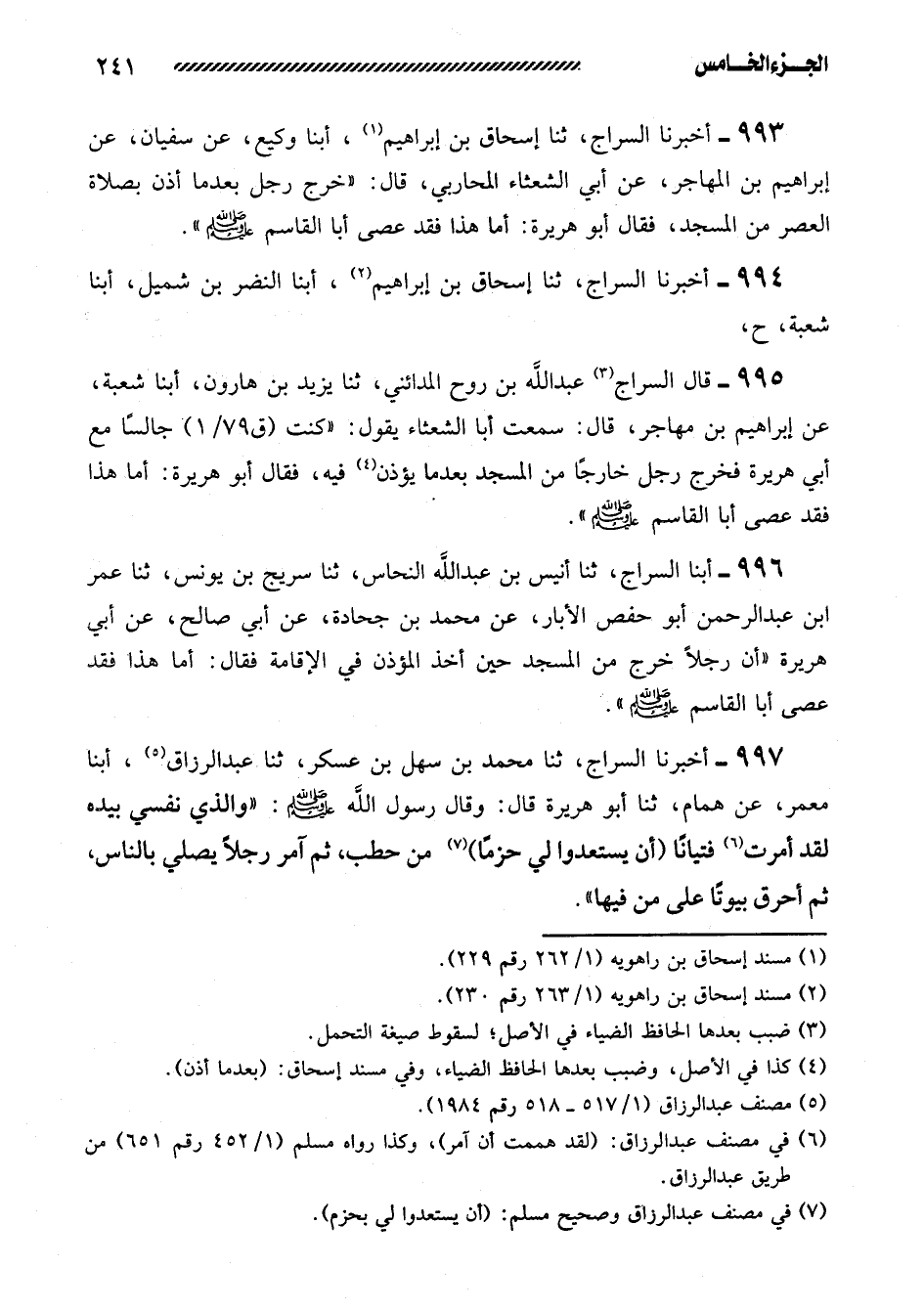 997- أخبرنا السراج، ثنا محمد بن سهل بن عسكر، ثنا عبد الرزاق، أبنا مَعْمَرٌ، عَنْ هَمَّامٍ، ثنا أَبُو هُرَيْرَةَ قَالَ: وقال رسول الله صلى الله عليه وسلم: ((وَالَّذِي نَفْسِي بِيَدِهِ لَقَدْ أَمَرْتُ فِتْيَانًا (أَنْ يَسْتَعْدُوا لِي حُزَمًا) مِنَ حَطَبٍ، ثُمَّ آمُرَ رَجُلا يُصَلِّي بِالنَّاسِ، ثُمَّ أُحَرِّقَ بُيُوتًا عَلَى من فيها)) .