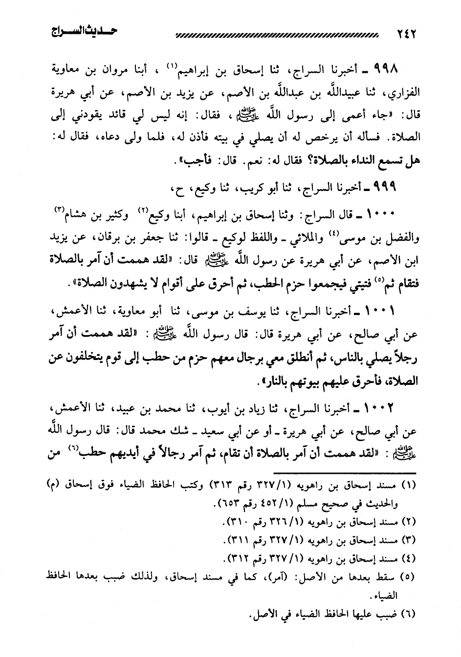 1000- قَالَ السَّرَّاجُ: وثنا إِسْحَاقُ بْنُ إِبْرَاهِيمَ، أبنا وَكِيعٌ وَكَثِيرُ بْنُ هِشَامٍ وَالْفَضْلُ بْنُ مُوسَى وَالْمُلائِيُّ -وَاللَّفْظُ لِوَكِيعٍ- قَالُوا: ثنا جَعْفَرُ بْنُ برقان، عن يزيد ابن الأَصَمِّ، عَنْ أَبِي هُرَيْرَةَ عَنْ رَسُولِ اللَّهِ صَلَّى اللَّهُ عَلَيهِ وَسَلَّمَ قَالَ: ((لَقَدْ هَمَمْتُ أَنْ آمُرَ بِالصَّلاةِ فَتُقَامُ ثُمَّ فِتْيَتِي فَيَجْمَعُوا حُزَمَ الْحَطَبِ، ثُمَّ أُحَرِّقَ عَلَى أَقْوَامٍ لا يشهدون الصلاة)) .
