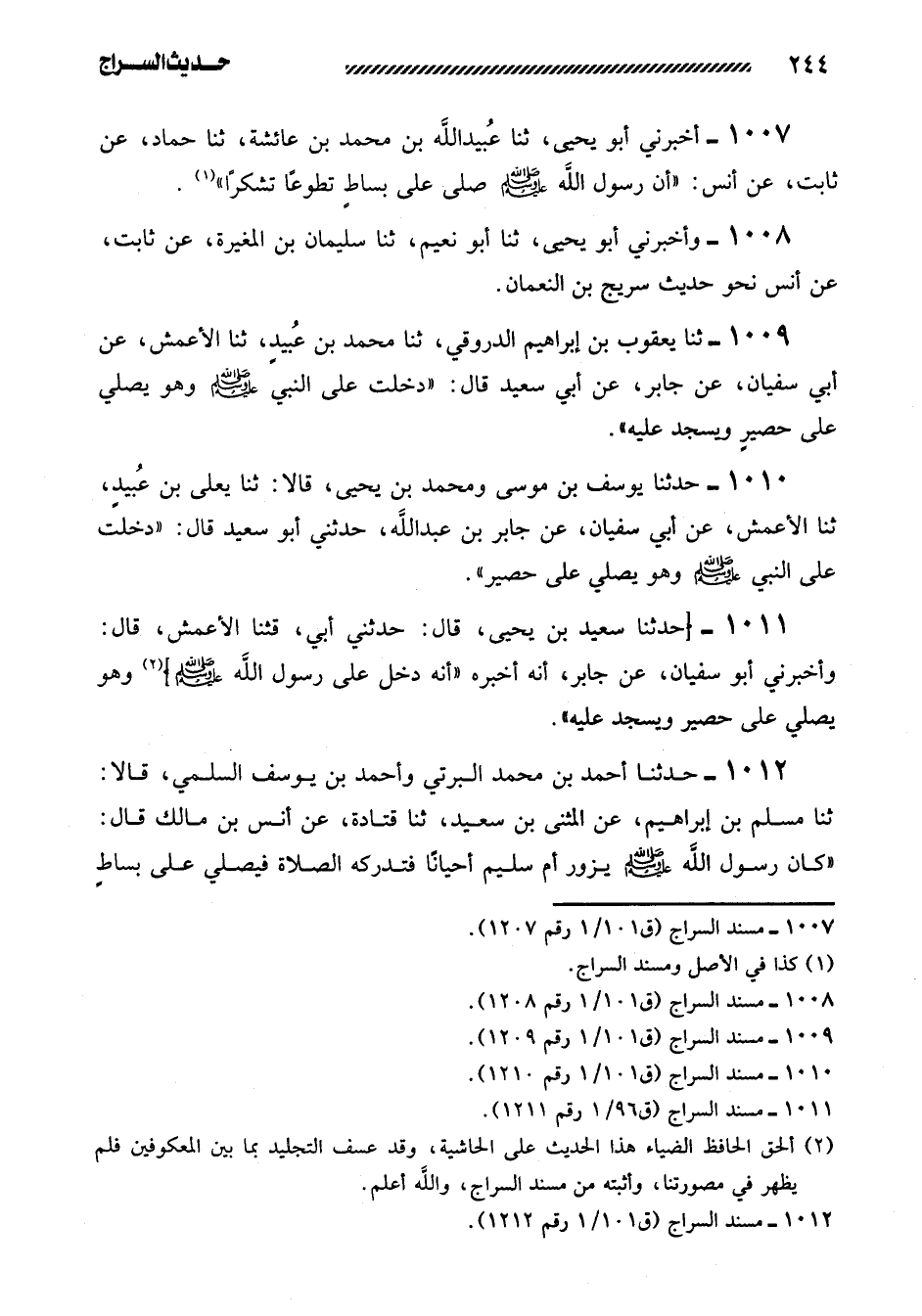 1007- أَخْبَرَنِي أَبُو يَحْيَى، ثنا عُبَيْدُ اللَّهِ بْنُ مُحَمَّدِ بْنِ عَائِشَةَ، ثنا حَمَّادٌ، عَنْ ثَابِتٍ، عَنْ أَنَسٍ: ((أَنَّ رَسُولَ اللَّهِ صَلَّى اللَّهُ عَلَيهِ وَسَلَّمَ صَلَّى عَلَى بساطٍ تَطَوُّعًا تَشَكُّرًا)) .