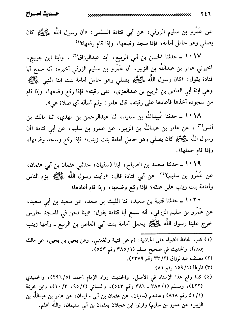 1018- حَدَّثَنَا عُبَيْدُ اللَّهِ بْنُ سَعِيدٍ، ثنا عَبْدُ الرَّحْمَنِ بْنُ مَهْدِيٍّ، ثنا مَالِكُ بْنُ أَنَسٍ، عَنْ عَامِرِ بْنِ عَبْدِ اللَّهِ بْنِ الزُّبَيْرِ، عَنْ عَمْرِو بْنِ سُلَيْمٍ، عَنْ أَبِي قَتَادَةَ ((أن رسول الله صلى الله عليه وسلم كَانَ يُصَلِّي وَهُوَ حَامِلٌ أُمَامَةَ بِنْتَ زَيْنَبَ؛ فَإِذَا رَكَعَ وَسَجَدَ وَضَعَهَا، وَإِذَا قَامَ حَمَلَهَا)) .