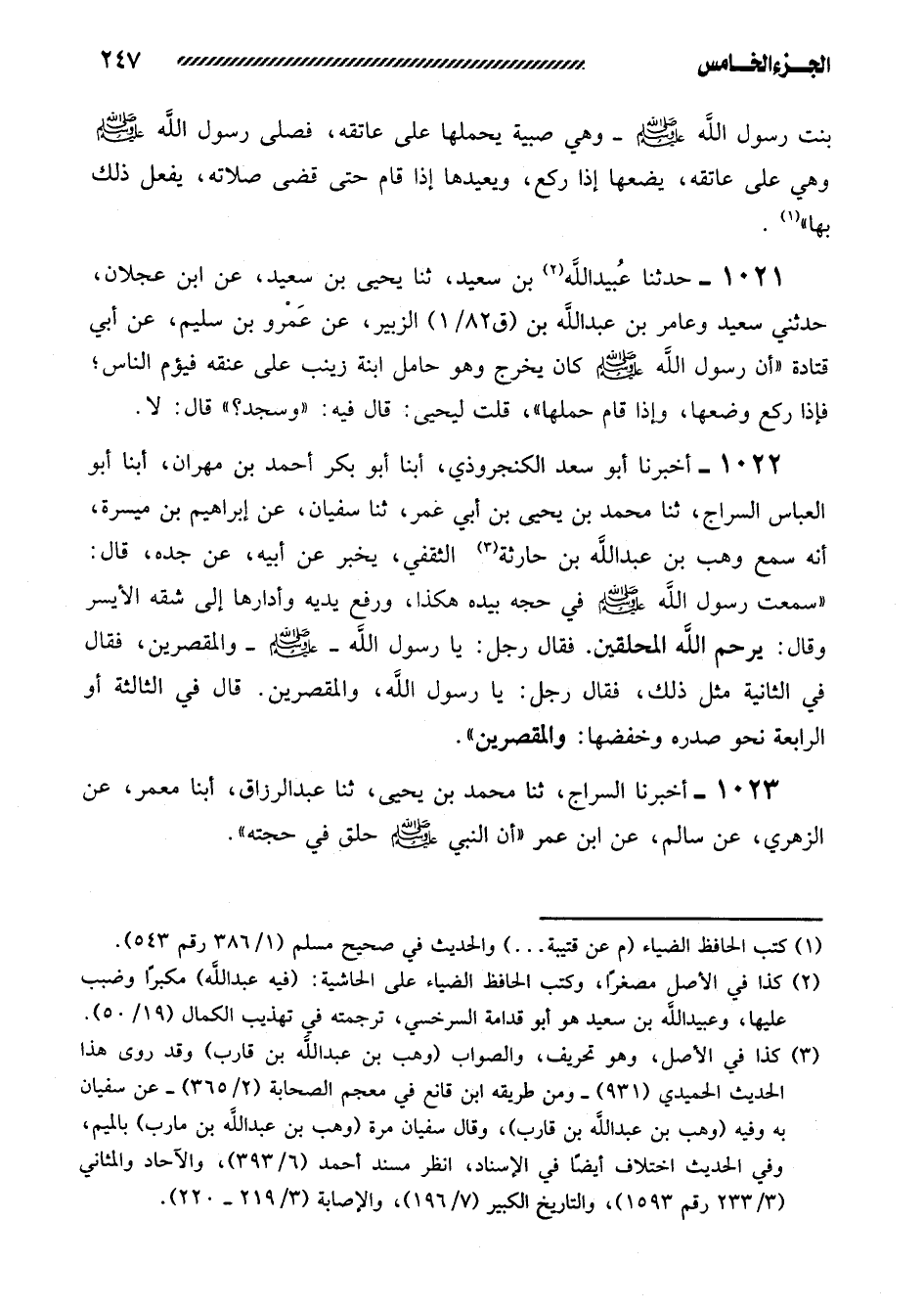 1023- أخبرنا السراج، ثنا محمد بن يحيى، ثنا عبد الرزاق، أبنا مَعْمَرٌ، عَنِ الزُّهْرِيِّ، عَنْ سَالِمٍ، عَنِ ابْنِ عمر ((أن النبي صلى الله عليه وسلم حَلَقَ فِي حَجَّتِهِ)) .