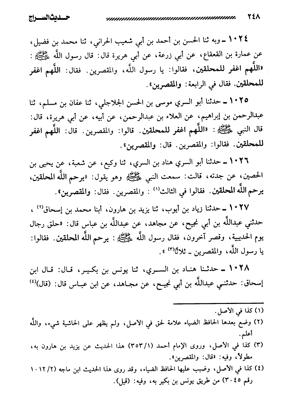 1024- وبه ثنا الْحَسَنُ بْنُ أَحْمَدَ بْنِ أَبِي شُعَيْبٍ الْحَرَّانِيِّ، ثنا مُحَمَّدُ بْنُ فُضَيْلٍ، عَنْ عُمَارَةَ بْنِ الْقَعْقَاعِ، عَنْ أَبِي زُرْعَةَ، عَنْ أبي هريرة قال: قال رسول الله صلى اللَّهُ عَلَيهِ وَسَلَّمَ: ((اللَّهُمَّ اغْفِرْ لِلْمُحَلِّقِينَ، فَقَالُوا: يا رسول الله، والمقصرين. فقال: اللَّهُمَّ اغْفِرْ لِلْمُحَلِّقِينَ. فَقَالَ فِي الرَّابِعَةِ: وَالْمُقَصِّرِينَ)) .