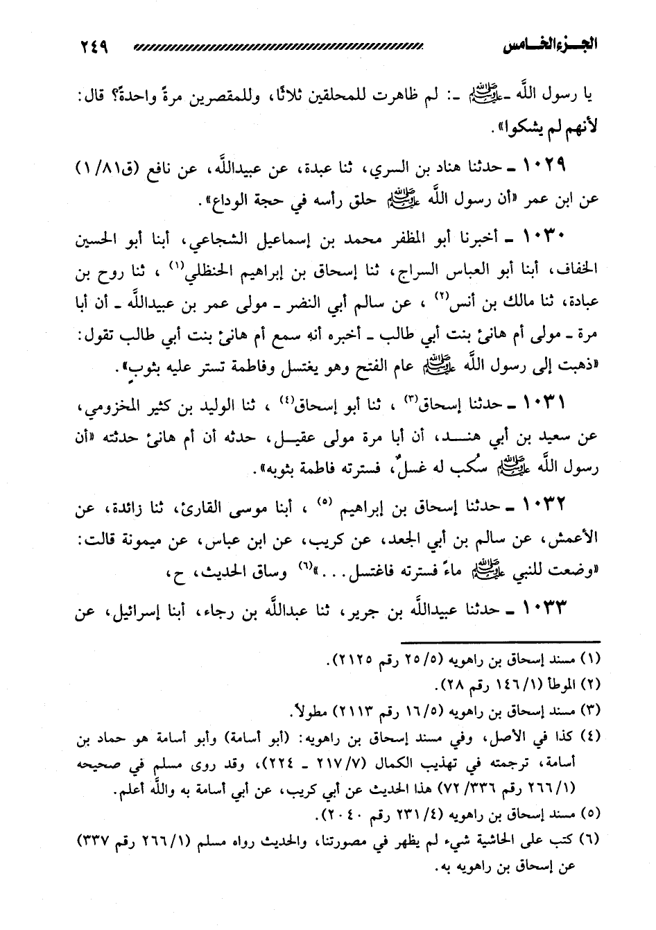 1032- حدثنا إسحاق بن إبراهيم، أبنا موسى القارئ، ثنا زَائِدَةُ، عَنِ الأَعْمَشِ، عَنْ سَالِمِ بْنِ أَبِي الْجَعْدِ، عَنْ كُرَيْبٍ، عَنِ ابْنِ عَبَّاسٍ، عَنْ مَيْمُونَةَ قَالَتْ: ((وَضَعْتُ لِلنَّبِيِّ صَلَّى اللَّهُ عليه وسلم ماءً فسترته فَاغْتَسَلَ ... )) وَسَاقَ الْحَدِيثَ