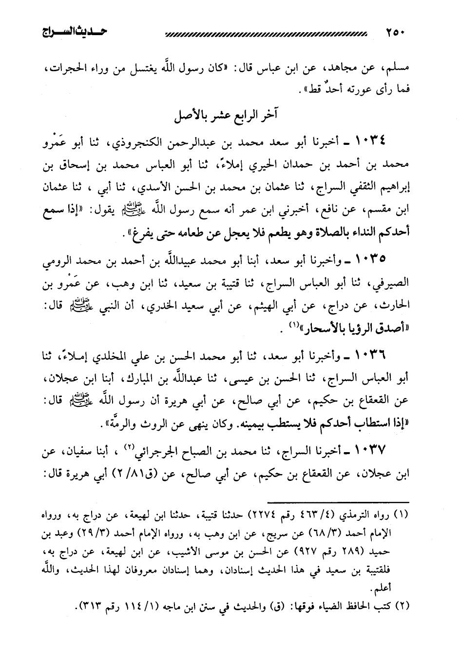 1035- وأخبرنا أبو سعد، أبنا أبو محمد عبيد اللَّهِ بْنُ أَحْمَدَ بْنِ مُحَمَّدٍ الرُّومِيُّ الصَّيْرَفِيُّ، ثنا أبو العباس السراج، ثنا قتيبة بن سَعِيدٍ، ثنا ابْنُ وَهْبٍ، عَنْ عَمْرِو بْنِ الْحَارِثِ، عَنْ دَرَّاجٍ، عَنْ أَبِي الْهَيْثَمِ، عَنْ أَبِي سَعِيدٍ الْخُدْرِيِّ، أَنَّ النَّبِيَّ صَلَّى اللَّهُ عَلَيهِ وَسَلَّمَ قَالَ: ((أَصْدَقُ الرُّؤْيَا بِالأَسْحَارِ)) .