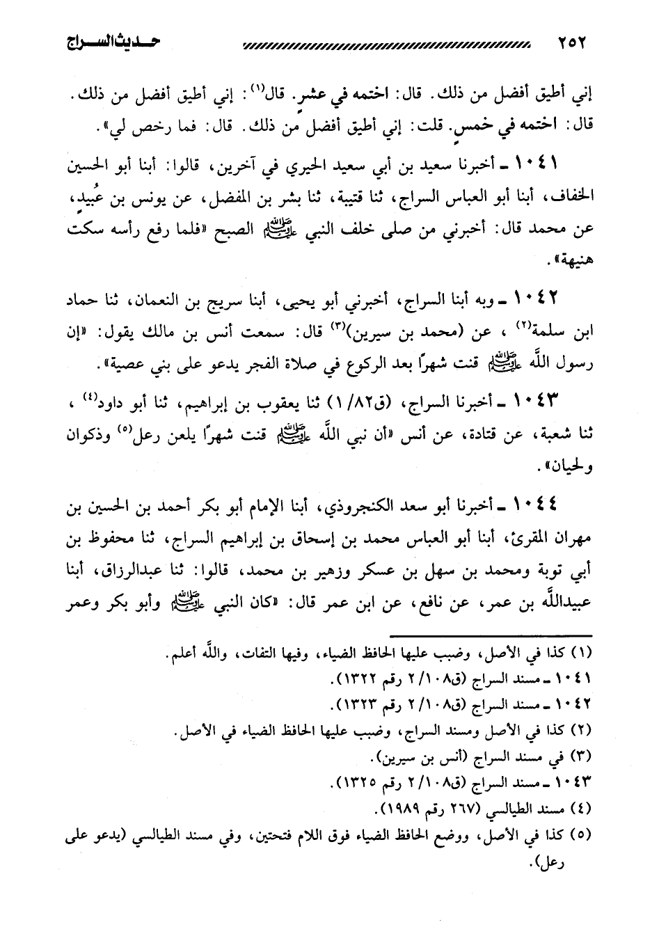 1042- وبه أبنا السراج، أخبرني أبو يحيى، أبنا سريج بن النعمان، ثنا حماد ابن سَلَمَةَ، عَنْ (مُحَمَّدِ بْنِ سِيرِينَ) قَالَ: سَمِعْتُ أَنَسَ بْنَ مَالِكٍ يَقُولُ: ((إِنَّ رَسُولَ اللَّهِ صَلَّى اللَّهُ عَلَيْهِ وَسَلَّمَ قَنَتَ شَهْرًا بَعْدَ الرُّكُوعِ فِي صَلاةِ الْفَجْرِ يَدْعُو عَلَى بَنِي عصية)) .