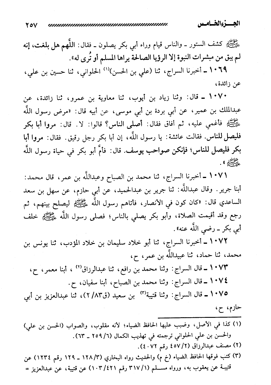 1071- أَخْبَرَنَا السَّرَّاجُ، ثنا مُحَمَّدُ بْنُ الصَّبَّاحِ وَعَبْدُ الله بن عمر، قال محمد: أبنا جَرِيرٌ، وَقَالَ عَبْدُ اللَّهِ: ثنا جَرِيرُ بْنُ عَبْدِ الْحَمِيدِ، عَنْ أَبِي حَازِمٍ، عَنْ سَهْلِ بْنِ سَعْدٍ السَّاعِدِيِّ قَالَ: ((كَانَ كَوْنٌ فِي الأنصار، فأتاهم رسول الله صلى الله عليه وسلم لِيُصْلِحَ بَيْنَهُمْ، ثُمَّ رَجَعَ وَقَدْ أُقِيمَتِ الصَّلاةُ، وَأَبُو بَكْرٍ يُصَلِّي بِالنَّاسِ؛ فَصَلَّى رَسُولُ اللَّهِ صَلَّى اللَّهُ عَلَيْهِ وَسَلَّمَ خَلْفَ أَبِي بَكْرٍ - رَضِيَ اللَّهُ عَنْهُ)) .