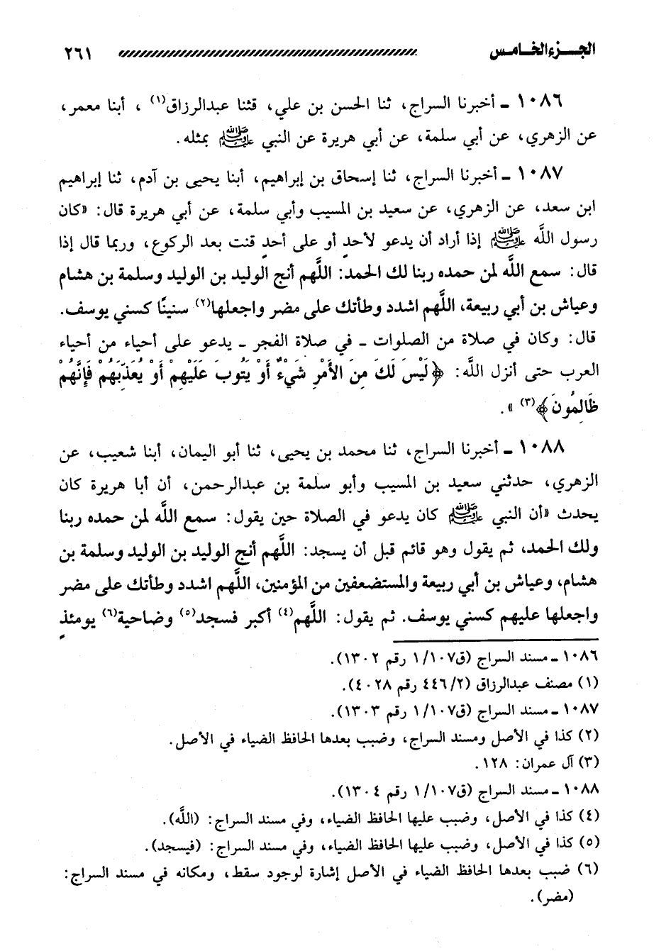 1087- أخبرنا السراج، ثنا إسحاق بن إبراهيم، أبنا يحيى بن آدم، ثنا إبراهيم ابن سَعْدٍ، عَنِ الزُّهْرِيِّ، عَنْ سَعِيدِ بْنِ الْمُسَيِّبِ وَأَبِي سَلَمَةَ، عَنْ أَبِي هُرَيْرَةَ قَالَ: ((كَانَ رسول الله صلى الله عليه وسلم إذا أَرَادَ أَنْ يَدْعُوَ لأحدٍ أَوْ عَلَى أحدٍ قَنَتَ بَعْدَ الرُّكُوعِ، وَرُبَّمَا قَالَ إِذَا قَالَ: سَمِعَ اللَّهُ لِمَنْ حَمِدَهُ رَبَّنَا لَكَ الْحَمْدُ: اللَّهُمَّ أَنْجِ الْوَلِيدَ بْنَ الْوَلِيدِ وَسَلَمَةَ بْنَ هشام وعياش بن أبي ربيعة، اللهم اشدد وطأتك على مضر واجعلها سنيناً كَسِنِي يُوسُفَ. قَالَ: وَكَانَ فِي صَلاةٍ مِنَ الصَّلَوَاتِ -فِي صَلاةِ الْفَجْرِ- يَدْعُو عَلَى أَحْيَاءٍ مِنْ أَحْيَاءِ الْعَرَبِ حَتَّى أَنْزَلَ اللَّهُ: {لَيْسَ لَكَ مِنَ الأَمْرِ شيءٌ أَوْ يَتُوبَ عَلَيْهِمْ أو يعذبهم فإنهم ظالمون} .