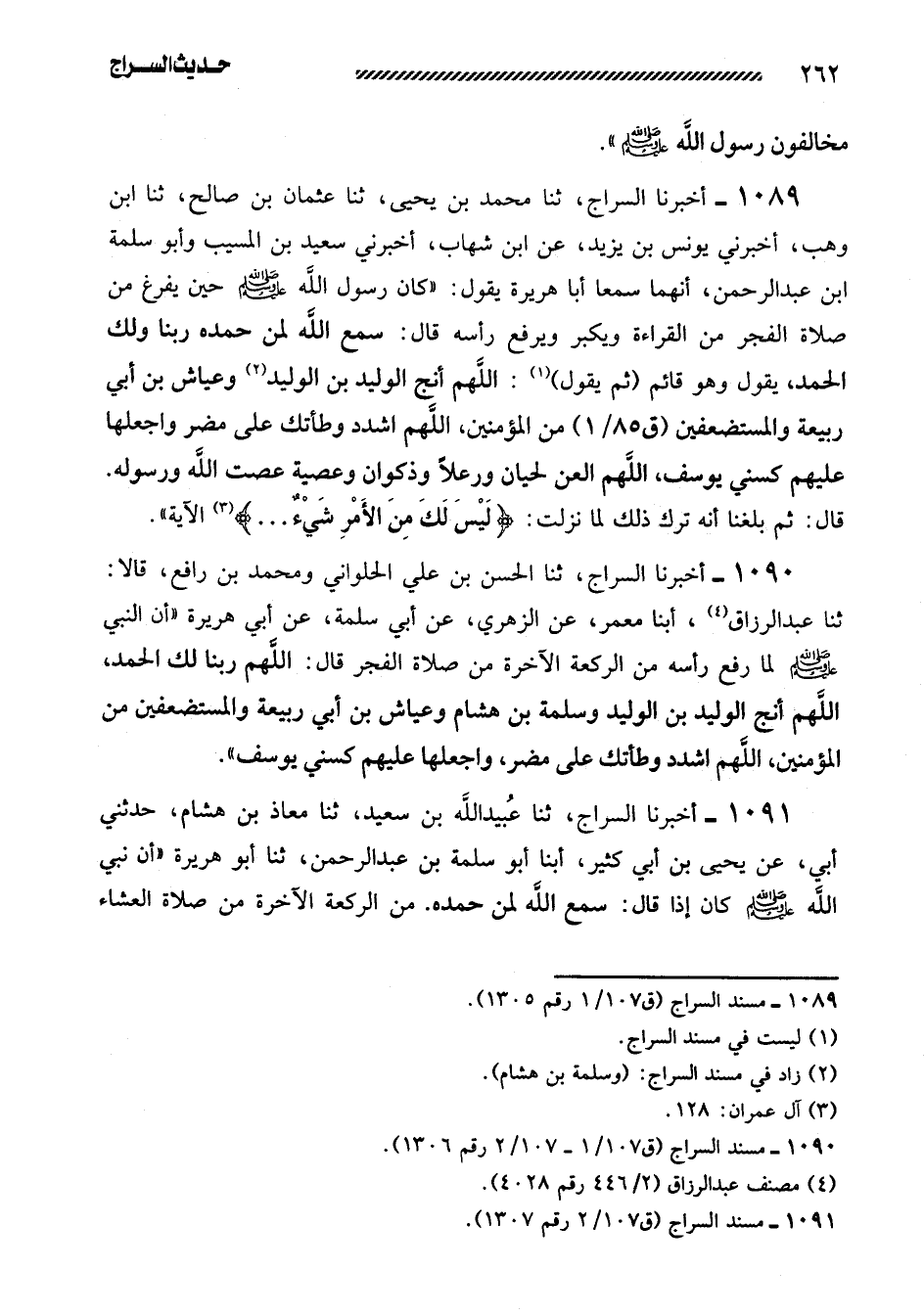 1090- أَخْبَرَنَا السَّرَّاجُ، ثنا الْحَسَنُ بْنُ عَلِيٍّ الْحُلْوَانِيُّ ومحمد بن رافع، قالا: ثنا عبد الرزاق، أبنا مَعْمَرٌ، عَنِ الزُّهْرِيِّ، عَنْ أَبِي سَلَمَةَ، عَنْ أبي هريرة ((أن النبي صلى الله عليه وَسَلَّمَ لَمَّا رَفَعَ رَأْسَهُ مِنَ الرَّكْعَةِ الآخِرَةِ من صَلاةِ الْفَجْرِ قَالَ: اللَّهُمَّ رَبَّنَا لَكَ الْحَمْدُ، اللَّهُمَّ أَنْجِ الْوَلِيدَ بْنَ الْوَلِيدِ وَسَلَمَةَ بْنَ هِشَامٍ وَعَيَّاشَ بْنَ أَبِي رَبِيعَةَ وَالْمُسْتَضْعَفِينَ مِنَ الْمُؤْمِنِينَ، اللَّهُمَّ اشْدُدْ وَطْأَتَكَ عَلَى مُضَرَ، وَاجْعَلْهَا عَلَيْهِمْ كَسِنِي يُوسُفَ)) .