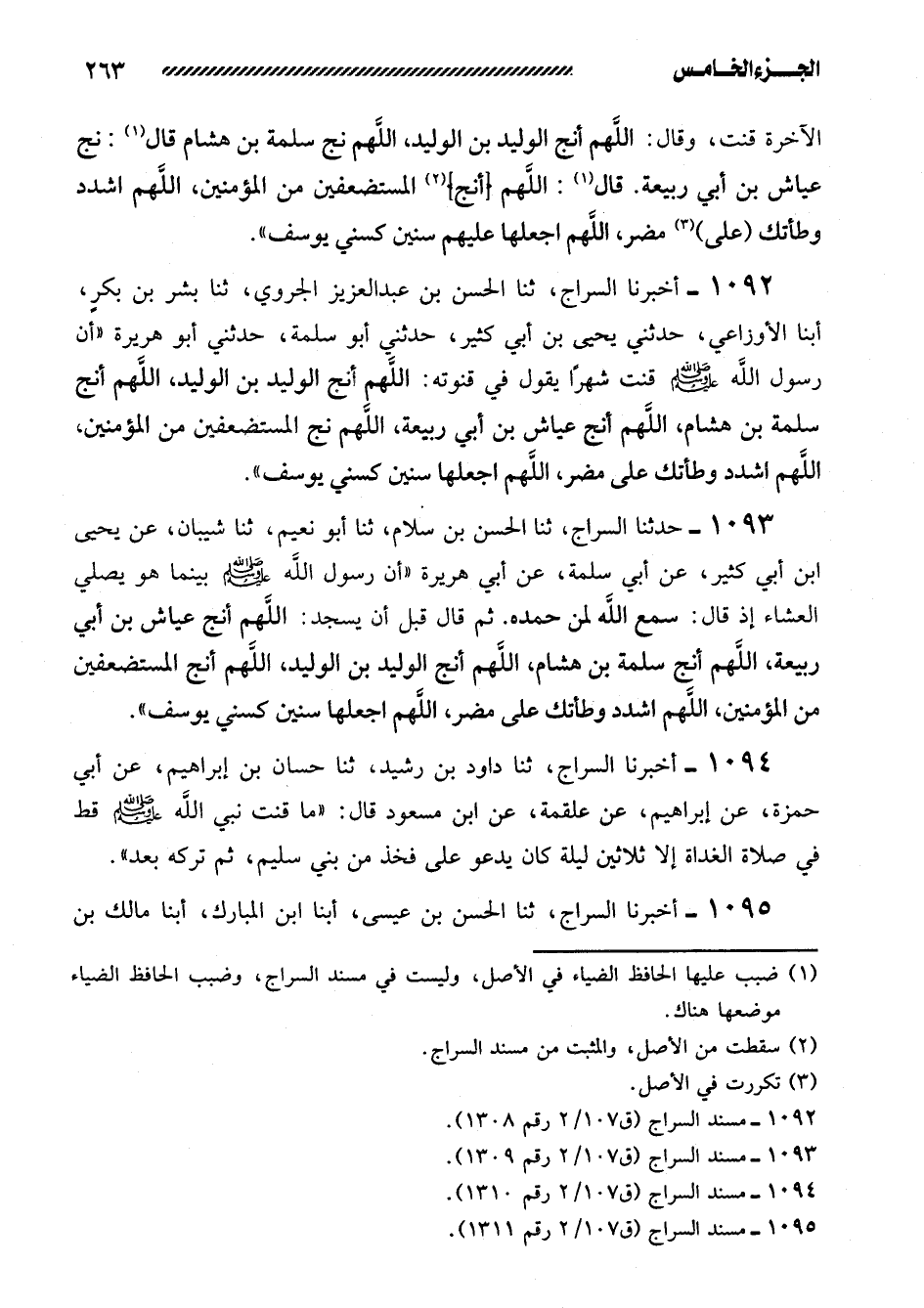 1092- أخبرنا السراج، ثنا الحسن بن عبد العزيز الجروي، ثنا بشر بن بكرٍ، أبنا الأَوْزَاعِيُّ، حَدَّثَنِي يَحْيَى بْنُ أَبِي كَثِيرٍ، حَدَّثَنِي أَبُو سَلَمَةَ، حَدَّثَنِي أَبُو هُرَيْرَةَ ((أَنَّ رَسُولَ اللَّهِ صَلَّى اللَّهُ عَلَيْهِ وَسَلَّمَ قَنَتَ شَهْرًا يَقُولُ فِي قُنُوتِهِ: اللَّهُمَّ أَنْجِ الْوَلِيدَ بْنَ الْوَلِيدِ، اللَّهُمَّ أَنْجِ سَلَمَةَ بْنَ هِشَامٍ، اللَّهُمَّ أنج عياش بن أبي ربيعة، اللهم نج الْمُسْتَضْعَفِينَ مِنَ الْمُؤْمِنِينَ، اللَّهُمَّ اشْدُدْ وَطْأَتَكَ عَلَى مضر، اللهم اجعلها سِنِينَ كَسِنِي يُوسُفَ)) .