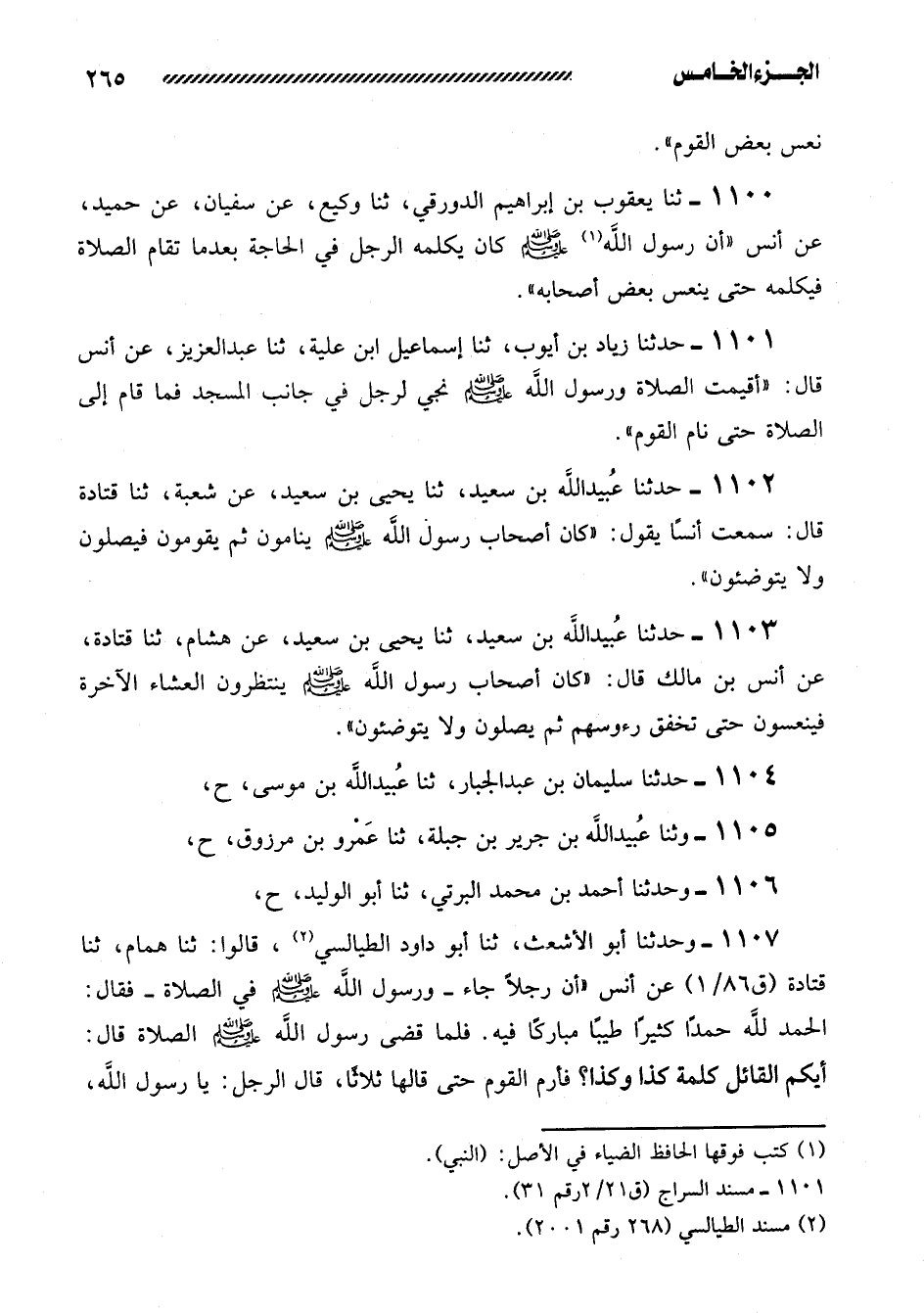 1100- ثنا يَعْقُوبُ بْنُ إِبْرَاهِيمَ الدَّوْرَقِيُّ، ثنا وَكِيعٌ، عَنْ سُفْيَانَ، عَنْ حُمَيْدٍ، عَنْ أَنَسٍ ((أَنَّ رسول الله صلى الله عليه وسلم كان يكلمه الرجل في الحاجة بعدما تقام الصلاة فيكلمه حتى ينعس بعض أصحابه)) .