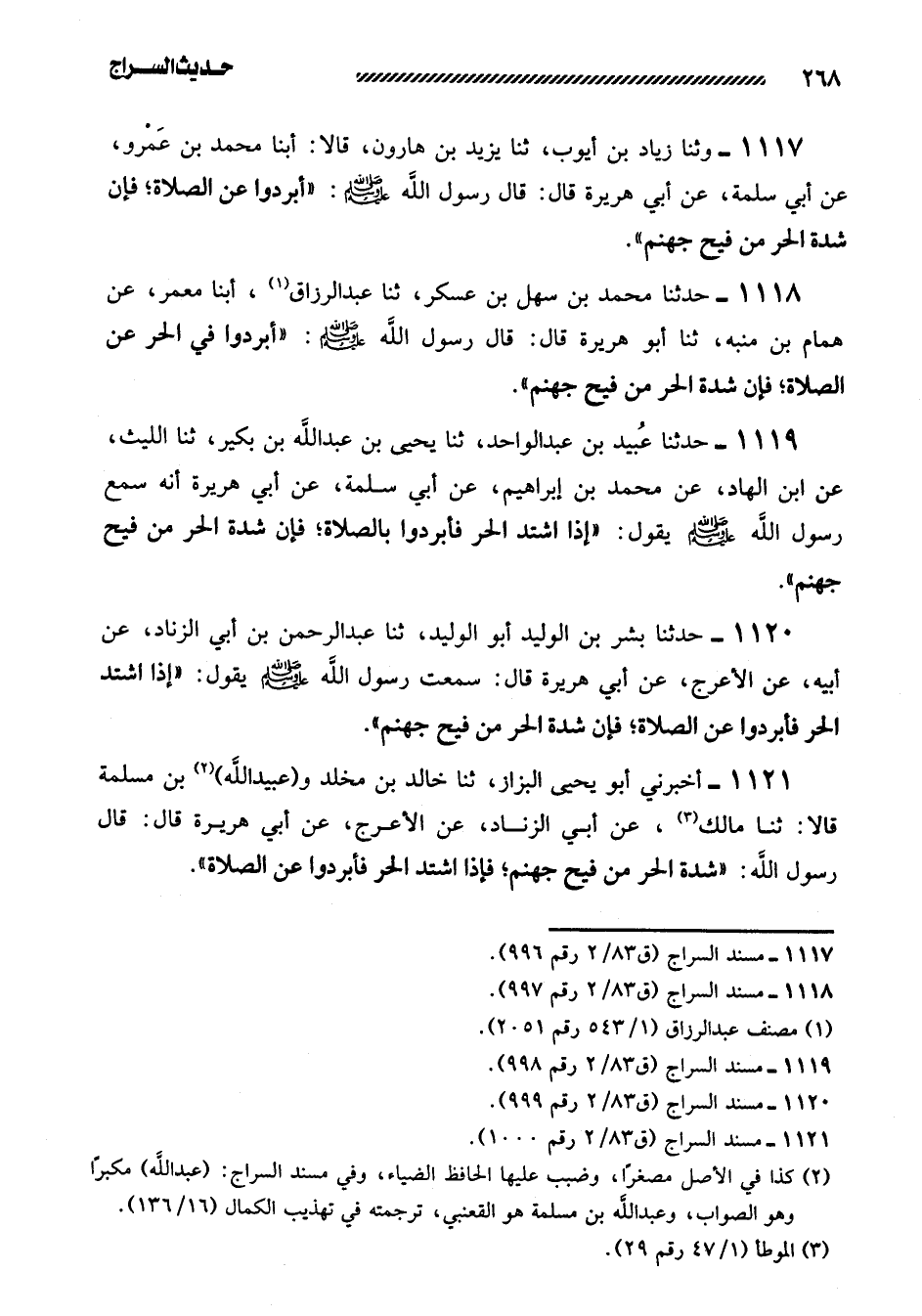 1121- أَخْبَرَنِي أَبُو يَحْيَى الْبَزَّازُ، ثنا خَالِدُ بْنُ مخلد و (عبيد اللَّهِ) بْنُ مَسْلَمَةَ قَالا: ثنا مَالِكٌ، عَنْ أَبِي الزِّنَادِ، عَنِ الأَعْرَجِ، عَنْ أَبِي هُرَيْرَةَ قال: قال رسول الله: ((شِدَّةُ الْحَرِّ مِنْ فَيْحِ جَهَنَّمَ؛ فَإِذَا اشْتَدَّ الْحَرُّ فَأَبْرِدُوا عَنِ الصَّلاةِ)) .