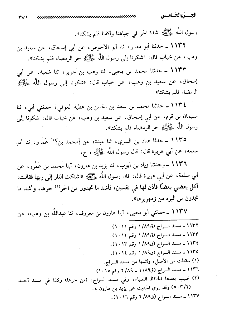 1132- حَدَّثَنَا أَبُو مَعْمَرٍ، ثنا أَبُو الأَحْوَصِ، عَنْ أَبِي إِسْحَاقَ، عَنْ سَعِيدِ بْنِ وَهْبٍ، عَنْ خَبَّابٍ قَالَ: ((شَكَوْنَا إِلَى رَسُولِ اللَّهِ صَلَّى اللَّهُ عَلَيْهِ وَسَلَّمَ حَرَّ الرَّمْضَاءِ فَلَمْ يُشْكِنَا)) .