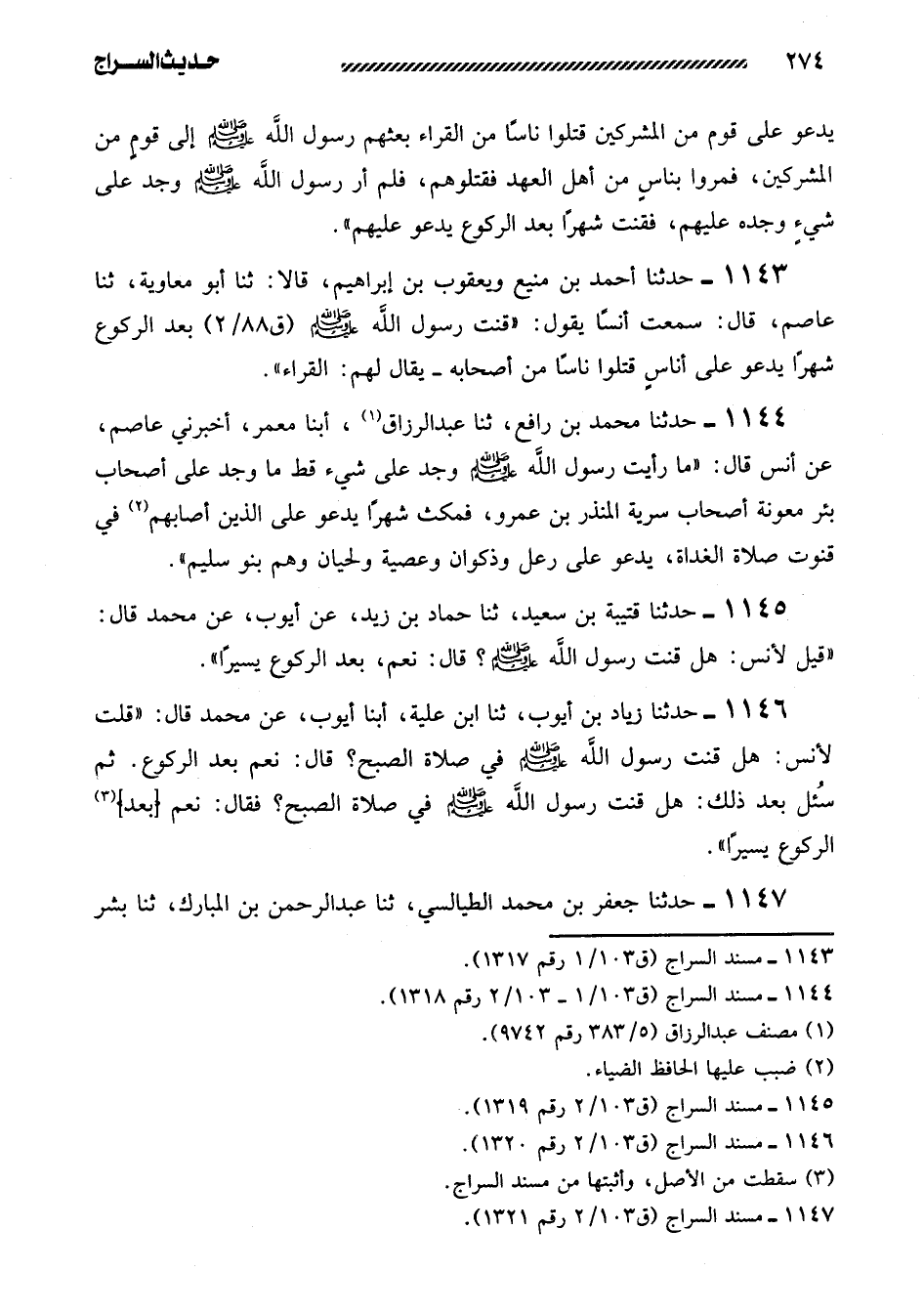 1143- حَدَّثَنَا أَحْمَدُ بْنُ مَنِيعٍ وَيَعْقُوبُ بْنُ إِبْرَاهِيمَ، قَالا: ثنا أَبُو مُعَاوِيَةَ، ثنا عَاصِمٌ، قَالَ: سَمِعْتُ أَنَسًا يَقُولُ: ((قَنَتَ رَسُولُ اللَّهِ صَلَّى اللَّهُ عَلَيْهِ وَسَلَّمَ بَعْدَ الرُّكُوعِ شَهْرًا يَدْعُو على أناسٍ قتلوا ناساً مِنْ أَصْحَابِهِ -يُقَالُ لَهُمُ: الْقُرَّاءُ)) .