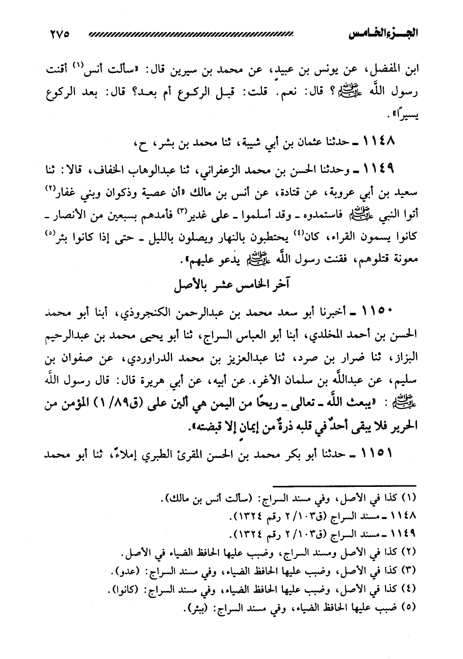 1149- وَحَدَّثَنَا الْحَسَنُ بْنُ مُحَمَّدٍ الزَّعْفَرَانِيُّ، ثنا عَبْدُ الْوَهَّابِ الْخَفَّافُ، قَالا: ثنا سعيد بن أبي عروبة، عن قتادة، عن أَنَسِ بْنِ مَالِكٍ ((أَنَّ عُصَيَّةَ وَذَكْوَانَ وَبَنِي غفار أَتَوُا النَّبِيَّ صَلَّى اللَّهُ عَلَيْهِ وَسَلَّمَ فَاسْتَمَدُّوهُ -وقد أسلموا- على غدير فَأَمَدَّهُمْ بِسَبْعِينَ مِنَ الأَنْصَارِ -كَانُوا يُسَمَّوْنَ الْقُرَّاءَ، كان يَحْتَطِبُونَ بِالنَّهَارِ وَيُصَلُّونَ بِاللَّيْلِ- حَتَّى إِذَا كَانُوا بئر مَعُونَةَ قَتَلُوهُمْ، فَقَنَتَ رَسُولُ اللَّهِ صَلَّى اللَّهُ عَلَيْهِ وَسَلَّمَ يَدْعُو عَلَيْهِمْ)) .