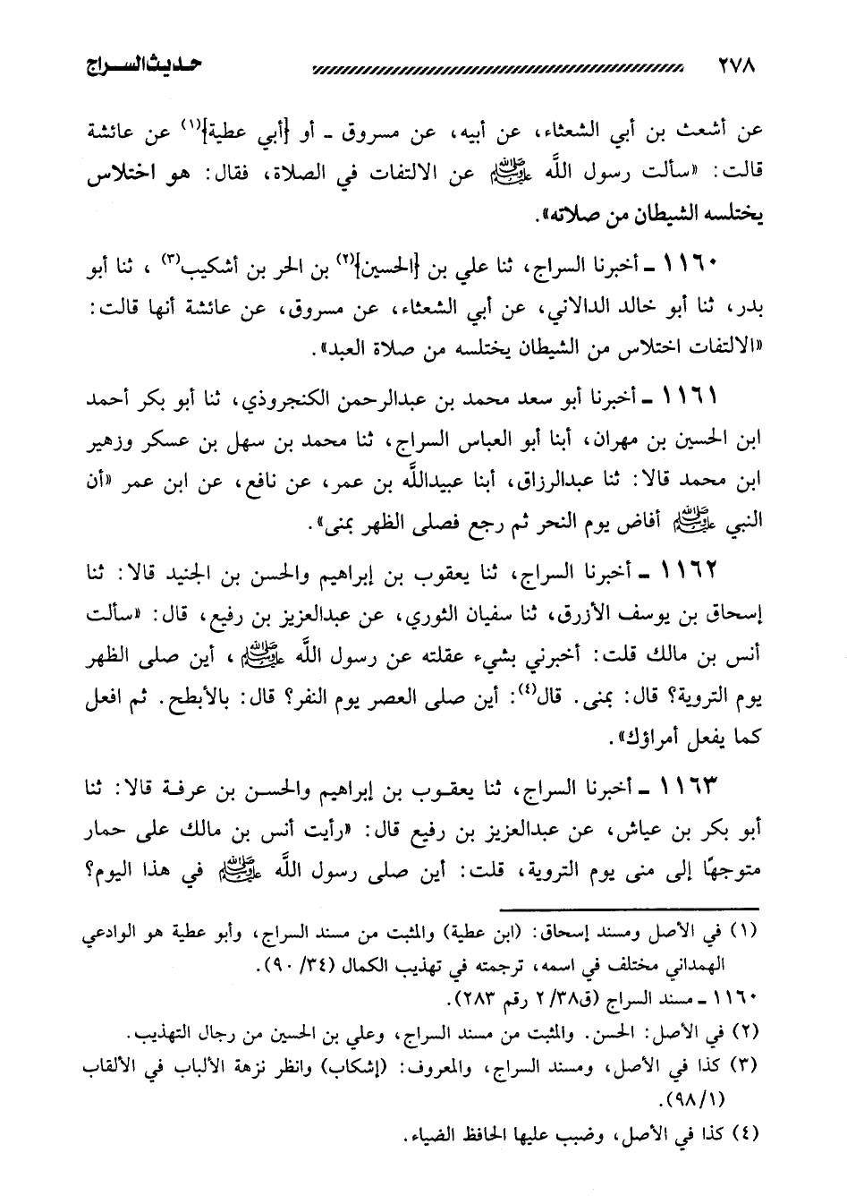 1160- أخبرنا السراج، ثنا علي بن [الحسين] بْنِ الْحُرِّ بْنِ أَشْكِيبَ، ثنا أَبُو بَدْرٍ، ثنا أَبُو خَالِدٍ الدَّالانِيُّ، عَنْ أَبِي الشَّعْثَاءِ، عَنْ مَسْرُوقٍ، عَنْ عَائِشَةَ أَنَّهَا قَالَتْ: ((الالْتِفَاتُ اخْتِلاسٌ مِنَ الشَّيْطَانِ يَخْتَلِسُهُ مِنْ صَلاةِ الْعَبْدِ)) .