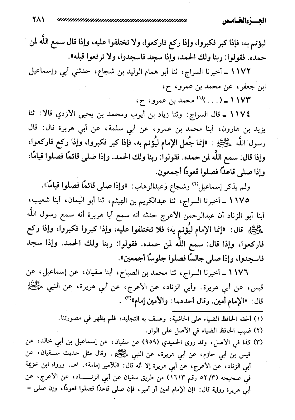 1175- أخبرنا السراج، ثنا عبد الكريم بن الهيثم، ثنا أبو اليمان، أبنا شعيب، أبنا أبو الزناد أن عبد الرحمن الأعرج حدثه أَنَّهُ سَمِعَ أَبَا هُرَيْرَةَ أَنَّهُ سَمِعَ رَسُولَ اللَّهِ صَلَّى اللَّهُ عَلَيْهِ وَسَلَّمَ قَالَ: ((إِنَّمَا الإِمَامُ لِيُؤْتَمَّ بِهِ؛ فَلا تَخْتَلِفُوا عَلَيْهِ، وَإِذَا كبروا فَكَبِّرُوا، وَإِذَا رَكَعَ فَارْكَعُوا، وَإِذَا قَالَ: سَمِعَ اللَّهُ لِمَنْ حَمِدَهُ. فَقُولُوا: رَبَّنَا وَلَكَ الْحَمْدُ. وَإِذَا سَجَدَ فَاسْجُدُوا، وَإِذَا صَلَّى جَالِسًا فَصَلُّوا جلوساً أجمعين)) .