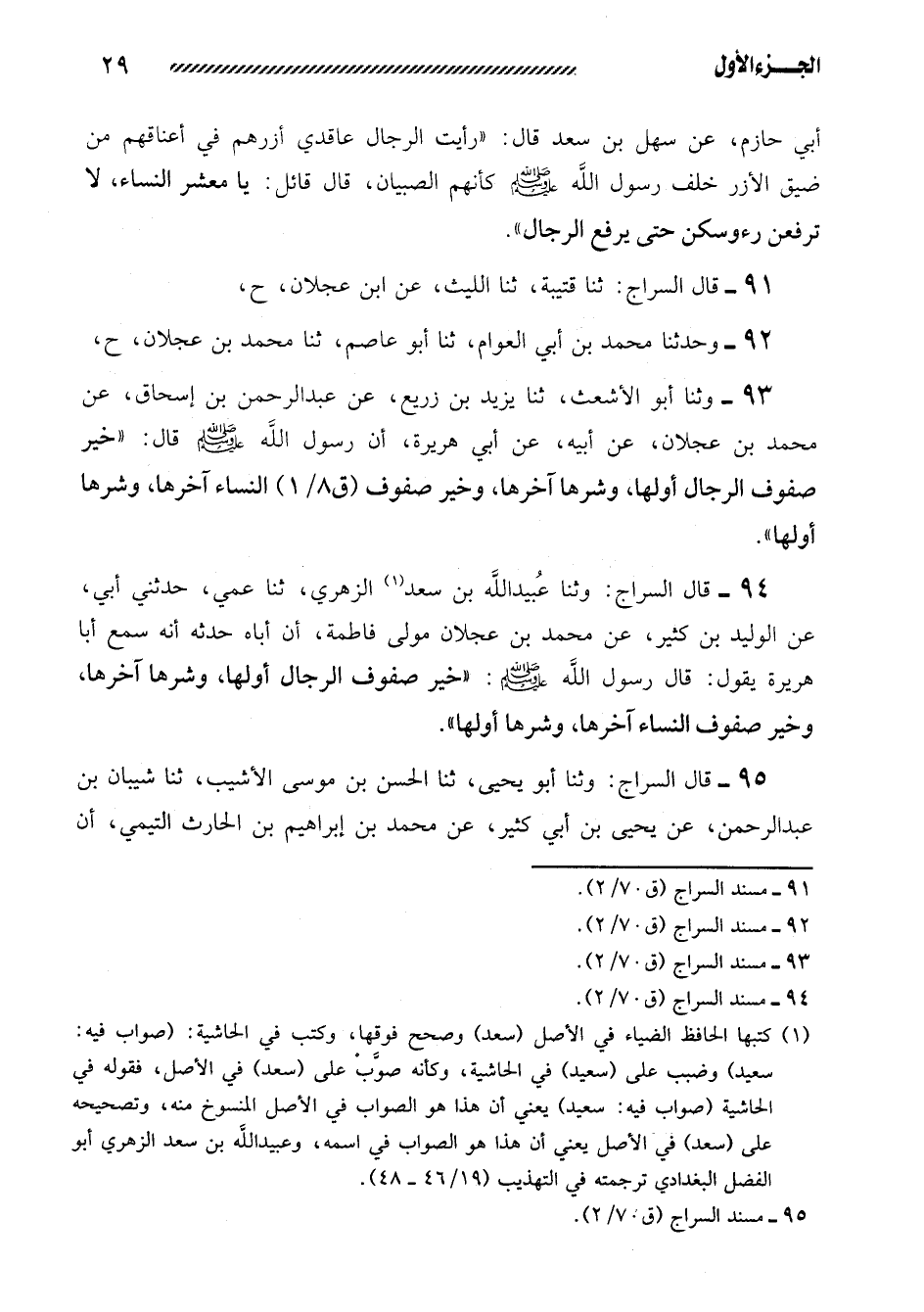 91- قَالَ السَّرَّاجُ: ثَنَا قُتَيْبَةُ، ثَنَا اللَّيْثُ، عَنِ ابْنِ عَجْلانَ، ح،