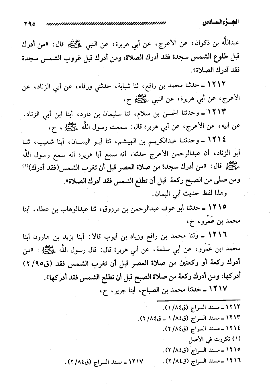 1212- حَدَّثَنَا مُحَمَّدُ بْنُ رَافِعٍ، ثنا شَبَابَةُ، حَدَّثَنِي وَرْقَاءُ، عَنْ أَبِي الزِّنَادِ، عَنِ الأَعْرَجِ، عَنْ أبي هريرة، عن النبي صلى الله عليه وَسَلَّمَ، ح،
