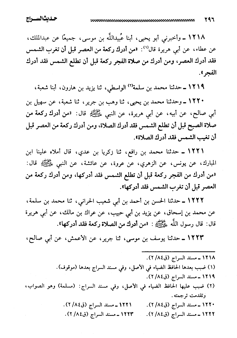 1223- حدثنا يوسف بن موسى، ثنا جرير، عن الأعمش، عن أبي صالح، -[297]- عن أبي هريرة (مرفوع) قَالَ: ((مَنْ أَدْرَكَ رَكْعَتَيْنِ -هَكَذَا قَالَ- مِنَ الْعَصْرِ قَبْلَ أَنْ تَغْرُبَ الشَّمْسُ فَقَدْ أَدْرَكَ الصَّلاةَ، وَمَنْ أَدْرَكَ رَكْعَةً مِنَ الْفَجْرِ قَبْلَ أَنْ تَطْلُعَ الشَّمْسِ فَقَدْ أَدْرَكَ الصَّلاةَ)) .