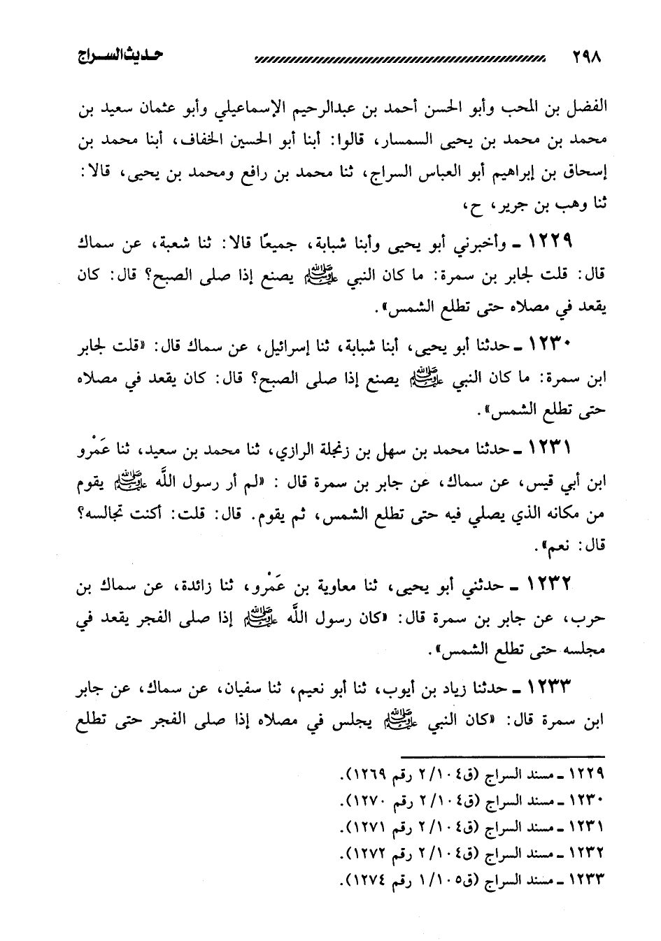 1233- حَدَّثَنَا زِيَادُ بْنُ أَيُّوبَ، ثنا أَبُو نُعَيْمٍ، ثنا سفيان، عن سماك، عن جابر ابن سَمُرَةَ قَالَ: ((كَانَ النَّبِيُّ صَلَّى اللَّهُ عَلَيْهِ وسلم يجلس في مصلاه إذا صلى الفجر حَتَّى تَطْلُعَ -[299]- الشَّمْسُ.