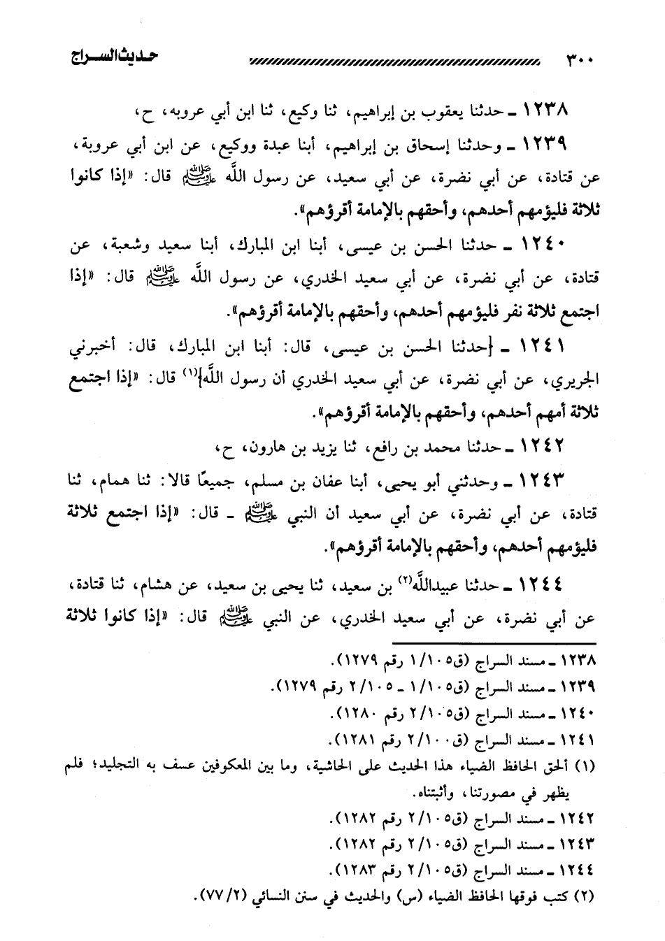 1243- وحدثني أبو يحيى، أبنا عَفَّانُ بْنُ مُسْلِمٍ، جَمِيعًا قَالا: ثنا هَمَّامٌ، ثنا قَتَادَةُ، عَنْ أَبِي نَضْرَةَ، عَنْ أَبِي سَعِيدٍ أَنَّ النَّبِيَّ صَلَّى اللَّهُ عَلَيْهِ وَسَلَّمَ - قَالَ: ((إِذَا اجْتَمَعَ ثَلاثَةٌ فَلْيَؤُمَّهُمْ أَحَدُهُمْ، وَأَحَقُّهُمْ بالإمامة أقرؤهم)) .