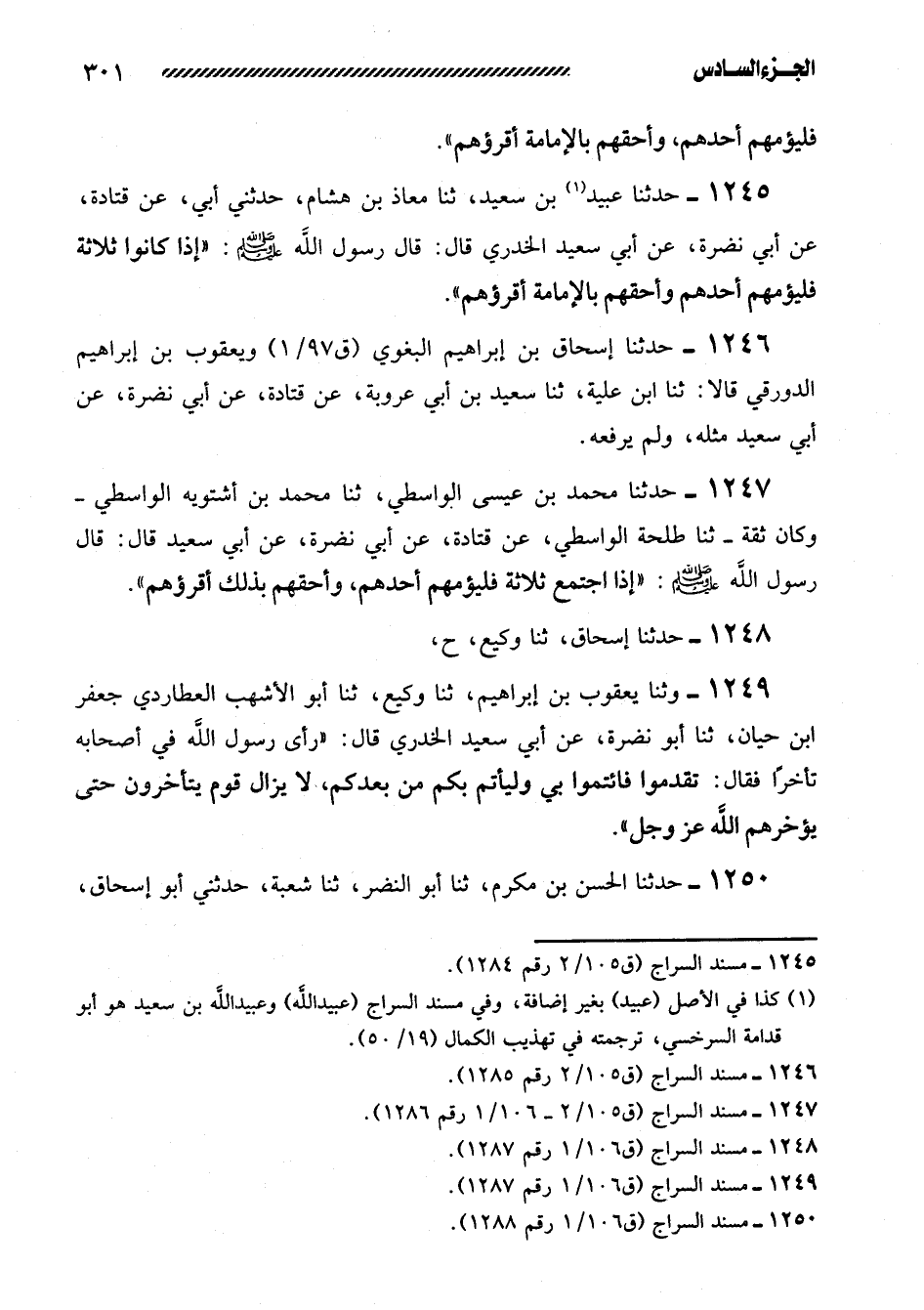 1245- حَدَّثَنَا عُبَيْدُ بْنُ سَعِيدٍ، ثنا مُعَاذُ بْنُ هِشَامٍ، حَدَّثَنِي أَبِي، عَنْ قَتَادَةَ، عَنْ أَبِي نَضْرَةَ، عَنْ أَبِي سَعِيدٍ الْخُدْرِيِّ قَالَ: قَالَ رسول الله صلى الله عليه وسلم: ((إذا كَانُوا ثَلاثَةً فَلْيَؤُمَّهُمْ أَحَدُهُمْ وَأَحَقُّهُمْ بِالإِمَامَةِ أَقْرَؤُهُمْ)) .