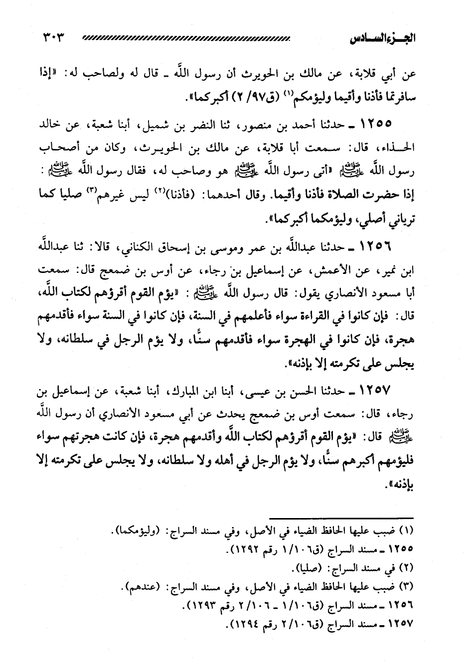 1257- حدثنا الحسن بن عيسى، أبنا ابن المبارك، أبنا شُعْبَةُ، عَنْ إِسْمَاعِيلَ بْنِ رَجَاءٍ، قَالَ: سَمِعْتُ أَوْسَ بْنَ ضَمْعَجٍ يُحَدِّثُ عَنْ أَبِي مَسْعُودٍ الأنصاري أن رسول الله صلى الله عليه وَسَلَّمَ قَالَ: ((يَؤُمُّ الْقَوْمَ أَقْرَؤُهُمْ لِكِتَابِ اللَّهِ وَأَقْدَمُهُمْ هِجْرَةً، فَإِنْ كَانَتْ هِجْرَتُهُمْ سَوَاءً فَلْيَؤُمَّهُمْ أَكْبَرُهُمْ سِنًّا، وَلا يُؤَمُّ الرَّجُلُ فِي أَهْلِهِ وَلا سُلْطَانِهِ، وَلا يُجْلَسُ عَلَى تَكْرِمَتِهِ إِلا بإذنه)) .