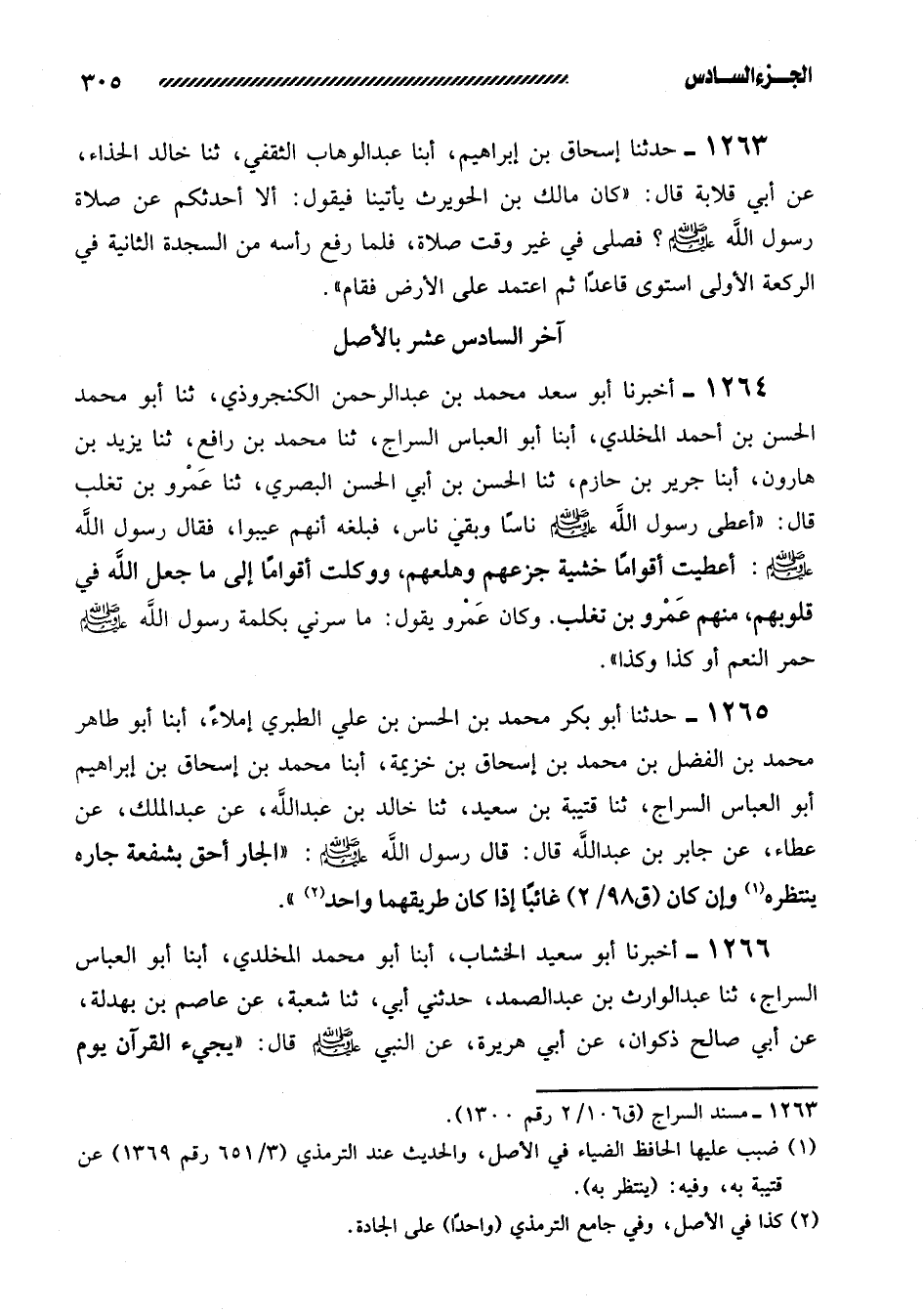 1264- أخبرنا أبو سعد محمد بن عبد الرحمن الكنجروذي، ثنا أبو محمد الحسن بن أحمد المخلدي، أبنا أبو العباس السراج، ثنا محمد بن رافع، ثنا يزيد بن هارون، أبنا جَرِيرُ بْنُ حَازِمٍ، ثنا الْحَسَنُ بْنُ أَبِي الْحَسَنِ الْبَصْرِيُّ، ثنا عَمْرُو بْنُ تَغْلِبَ قَالَ: ((أَعْطَى رَسُولُ اللَّهِ صَلَّى اللَّهُ عَلَيْهِ وَسَلَّمَ ناساً وبقي ناس، فبلغه أنهم عيبوا، فقال رسول الله صلى الله عليه وسلم: أعطيت أقواماً خشية جَزَعَهُمْ وَهَلَعَهُمْ، وَوَكَلْتُ أَقْوَامًا إِلَى مَا جَعَلَ اللَّهُ فِي قُلُوبِهِمْ، مِنْهُمْ عَمْرُو بْنُ تَغْلِبَ. وَكَانَ عَمْرٌو يَقُولُ: مَا سَرَّنِي بِكَلِمَةِ رَسُولِ اللَّهِ صَلَّى اللَّهُ عَلَيْهِ وَسَلَّمَ حُمْرُ النَّعَمِ أَوْ كَذَا وَكَذَا)) .