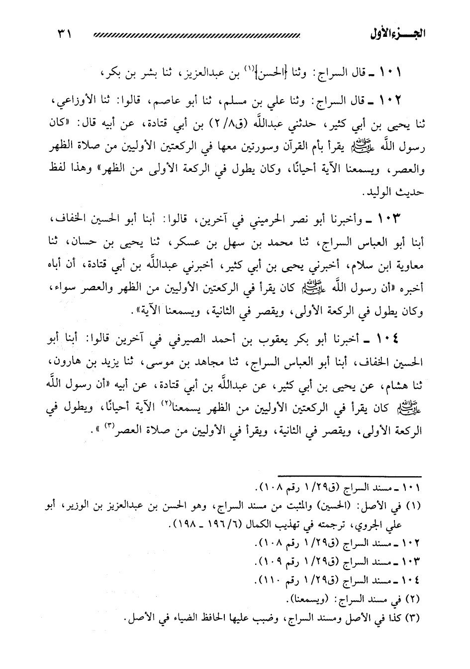 104- أَخْبَرَنَا أَبُو بَكْرٍ يَعْقُوبُ بْنُ أَحْمَدَ الصَّيْرَفِيُّ في آخرين قالوا: أبنا أبو الحسين الخفاف، أبنا أَبُو الْعَبَّاسِ السَّرَّاجُ، ثَنَا مُجَاهِدُ بْنُ مُوسَى، ثنا يَزِيدُ بْنُ هَارُونَ، ثَنَا هِشَامٌ، عَنْ يَحْيَى بن أبي كثير، عن عبد الله بن أَبِي قَتَادَةَ، عَنْ أَبِيهِ ((أَنَّ رَسُولَ اللَّهِ صَلَّى اللَّهُ عَلَيْهِ وَسَلَّمَ كَانَ يَقْرَأُ فِي الرَّكْعَتَيْنِ الأُولَيَيْنِ مِنَ الظُّهْرِ يُسْمِعُنَا الآيَةَ أَحْيَانًا، وَيُطَوِّلُ فِي الرَّكْعَةِ الأُولَى، وَيُقَصِّرُ فِي الثَّانِيَةِ، وَيَقْرَأُ فِي الأُولَيَيْنِ مِنْ صَلاةِ الْعَصْرِ)) .