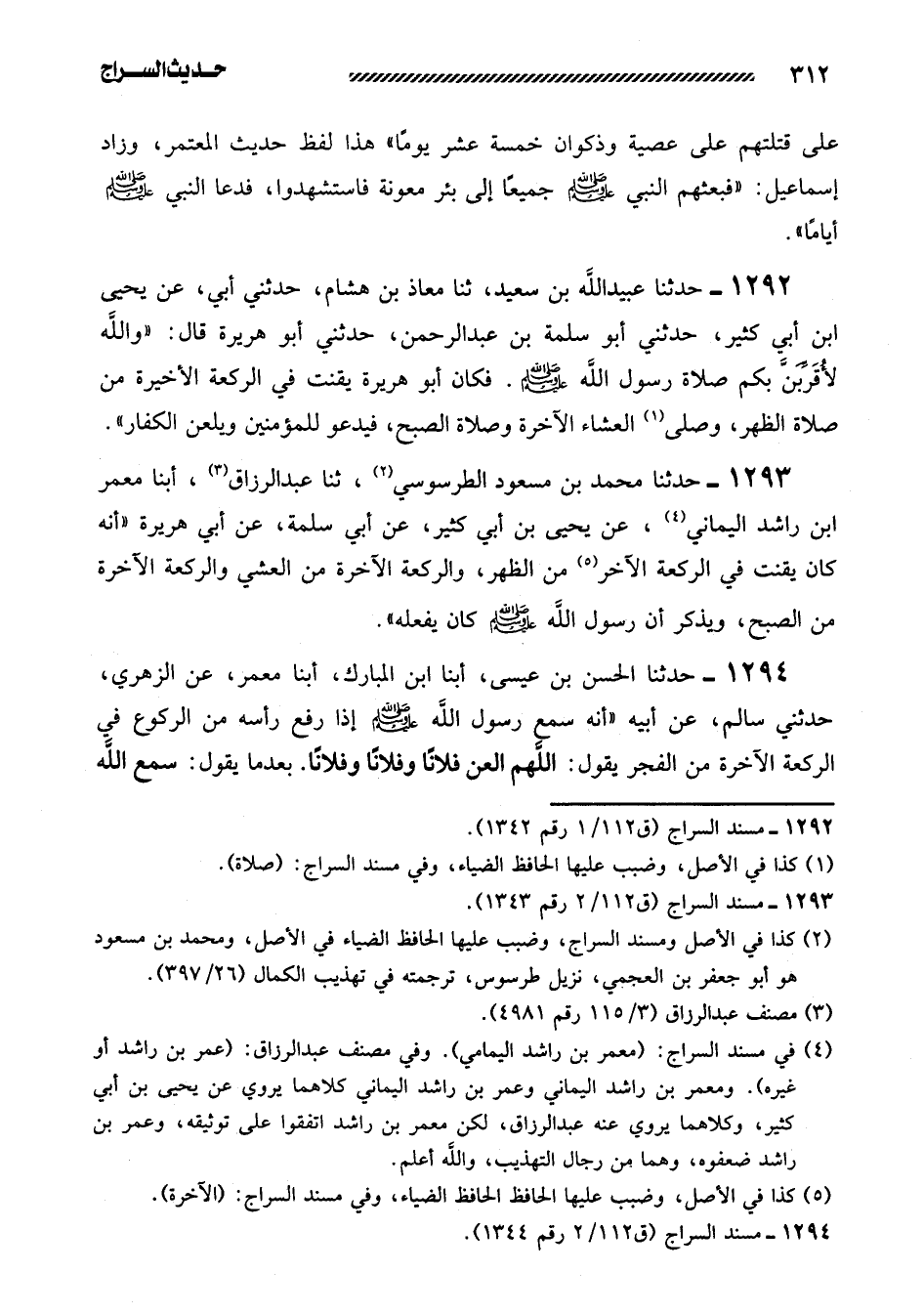 1293- حَدَّثَنَا مُحَمَّدُ بْنُ مَسْعُودٍ الطَّرَسُوسِيُّ، ثنا عَبْدُ الرزاق، أبنا معمر ابن رَاشِدٍ الْيَمَانِيُّ، عَنْ يَحْيَى بْنِ أَبِي كَثِيرٍ، عَنْ أَبِي سَلَمَةَ، عَنْ أَبِي هُرَيْرَةَ ((أَنَّهُ كَانَ يَقْنُتُ فِي الرَّكْعَةِ الآخِرَةِ مِنَ الظُّهْرِ، والركعة الآخرة من العشي وَالرَّكْعَةِ الآخِرَةِ مِنَ الصُّبْحِ، وَيَذْكُرُ أَنَّ رَسُولَ الله صلى الله عليه وسلم كان يفعله)) .