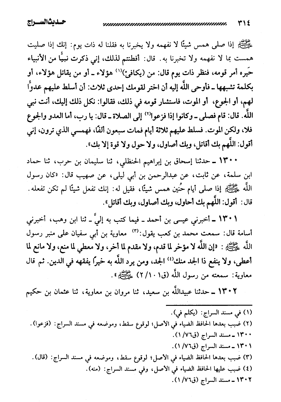 1300- حَدَّثَنَا إِسْحَاقُ بْنُ إِبْرَاهِيمَ الْحَنْظَلِيُّ، ثنا سُلَيْمَانُ بن حرب، ثنا حماد ابن سَلَمَةَ، عَنْ ثَابِتٍ، عَنْ عَبْدِ الرَّحْمَنِ بْنِ أَبِي لَيْلَى، عَنْ صُهَيْبٍ قَالَ: ((كَانَ رَسُولُ اللَّهِ صَلَّى اللَّهُ عَلَيْهِ وَسَلَّمَ إِذَا صَلَّى أَيَّامَ حُنَيْنٍ هَمَسَ شَيْئًا فَقِيلَ لَهُ: إِنَّكَ تَفْعَلُ شَيْئًا لَمْ تَكُنْ تَفْعَلْهُ. قَالَ: أَقُولُ: اللَّهُمَّ بِكَ أُحَاوِلُ، وَبِكَ أُصَاوِلُ، وَبِكَ أُقَاتِلُ)) .