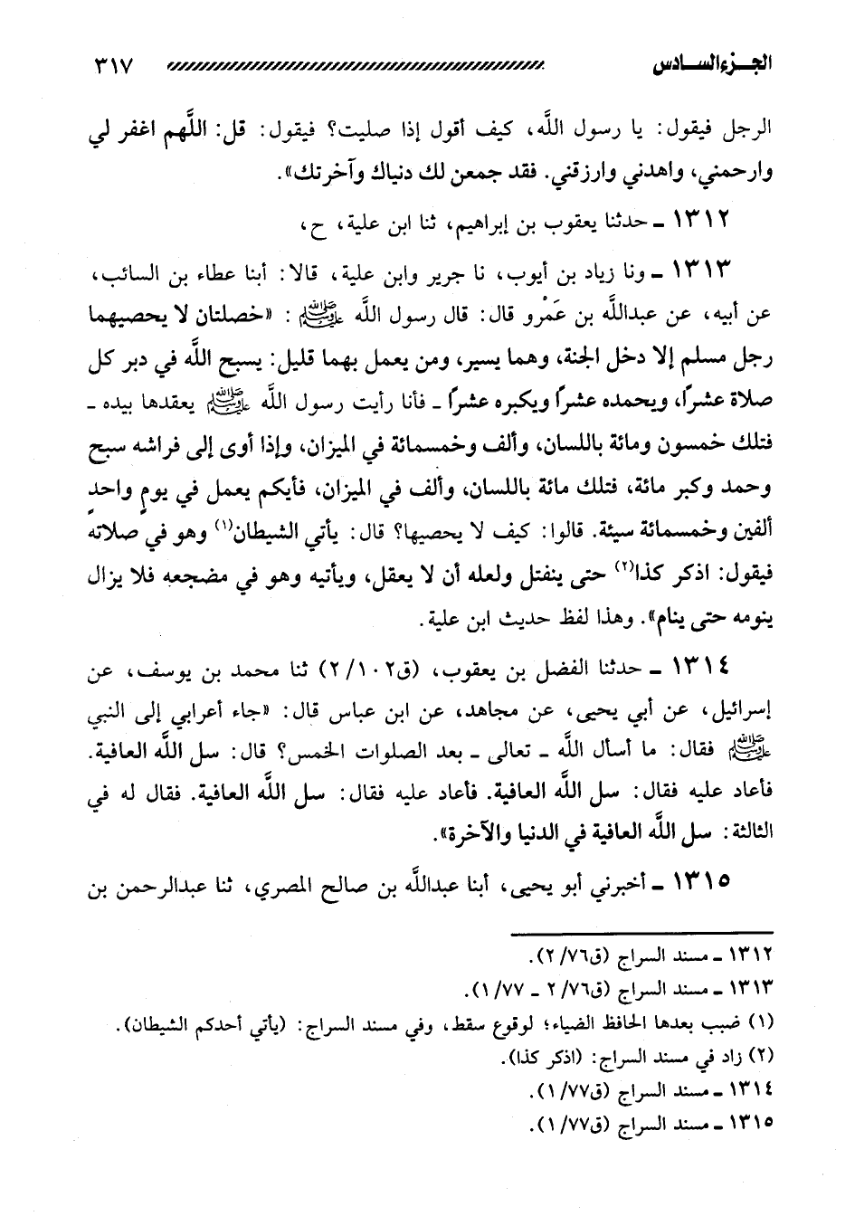 1313- ونا زياد بن أيوب، نا جرير وابن علية، قالا: أبنا عطاء بن السائب، عن أبيه عن عبد اللَّهِ بْنِ عَمْرٍو قَالَ: قَالَ رَسُولُ اللَّهِ صلى الله عليه وسلم: ((خصلتان لا يحصيهما رَجُلٌ مُسْلِمٌ إِلا دَخَلَ الْجَنَّةَ، وَهُمَا يَسِيرٌ، وَمَنْ يَعْمَلُ بِهِمَا قَلِيلٌ: يُسَبِّحُ اللَّهَ فِي دبر كل صلاة عشرا، ويحمده عشرا ويكبره عَشْرًا -فَأَنَا رَأَيْتُ رَسُولَ اللَّهِ صَلَّى اللَّهُ عَلَيْهِ وَسَلَّمَ يَعْقِدُهَا بِيَدِهِ- فَتِلْكَ خَمْسُونَ وَمِائَةٌ باللسان، وألف وخمسمائة فِي الْمِيزَانِ، وَإِذَا آوَى إِلَى فِرَاشِهِ سَبَّحَ وَحَمِدَ وَكَبَّرَ مِائَةً، فَتِلْكَ مِائَةٌ بِاللِّسَانِ، وَأَلْفٌ فِي الْمِيزَانِ، فَأَيُّكُمْ يَعْمَلُ فِي يومٍ واحدٍ ألفين وخمسمائة سَيِّئَةٍ. قَالُوا: كَيْفَ لا يُحْصِيهَا؟ قَالَ: يَأْتِي الشَّيْطَانُ وَهُوَ فِي صَلاتِهِ فَيَقُولُ: اذْكُرْ كَذَا حَتَّى يَنْفَتِلَ وَلَعَلَّهُ أَنْ لا يَعْقِلَ، وَيَأْتِيهِ وَهُوَ فِي مَضْجَعِهِ فَلا يَزَالُ يُنَوِّمُهُ حَتَّى يَنَامَ)) . وَهَذَا لَفْظُ حَدِيثِ ابْنِ عُلَيَّةَ.