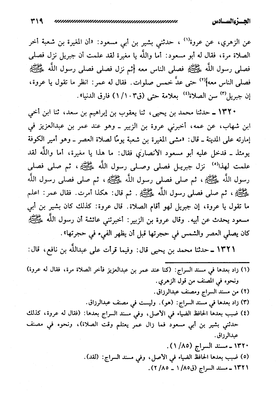 1320- حدثنا محمد بن يحيى، ثنا يعقوب بن إبراهيم بن سعد، ثنا ابن أخي ابن شِهَابٍ، عَنْ عَمِّهِ، أَخْبَرَنِي عُرْوَةُ بْنُ الزُّبَيْرِ -وَهُوَ عِنْدَ عُمَرَ بْنِ عَبْدِ الْعَزِيزِ فِي إمارته على المدينة- قال: ((مشى المغيرة بن شعبة يوماً لصلاة الْعَصْرِ -وَهُوَ أَمِيرُ الْكُوفَةِ يومئذٍ- فَدَخَلَ عَلَيْهِ أَبُو مَسْعُودٍ الأَنْصَارِيُّ فَقَالَ: مَا هَذَا يَا مغيرة، أما والله لقد علمت لهذا نَزَلَ جِبْرِيلُ فَصَلَّى وَصَلَّى رَسُولُ اللَّهِ صَلَّى اللَّهُ عَلَيْهِ وَسَلَّمَ، ثُمَّ صَلَّى فَصَلَّى رَسُولُ اللَّهِ صَلَّى اللَّهُ عَلَيْهِ وَسَلَّمَ، ثُمَّ صَلَّى فصلى رسول الله صلى الله عليه وسلم، ثُمَّ صَلَّى فَصَلَّى رَسُولُ اللَّهِ صَلَّى اللَّهُ عَلَيْهِ وَسَلَّمَ، ثُمَّ صَلَّى فَصَلَّى رَسُولُ اللَّهِ صَلَّى اللَّهُ عَلَيْهِ وَسَلَّمَ. ثُمَّ قَالَ: هَكَذَا أُمِرْتُ. فَقَالَ عُمَرُ: اعْلَمْ مَا تَقُولُ يَا عُرْوَةُ، إِنَّ جِبْرِيلَ لهُوَ أَقَامَ الصَّلاةَ. قَالَ عُرْوَةُ: كَذَلِكَ كَانَ بَشِيرُ بْنُ أَبِي مَسْعُودٍ يُحَدِّثُ عَنْ أَبِيهِ. وَقَالَ عُرْوَةُ بْنُ الزُّبَيْرِ: أَخْبَرَتْنِي عَائِشَةُ أَنَّ رَسُولَ اللَّهِ صَلَّى اللَّهُ عليه وسلم كان يصلي العصر والشمس في حُجْرَتِهَا قَبْلَ أَنْ يَظْهَرَ الْفَيْءُ فِي حُجْرَتِهَا)) .